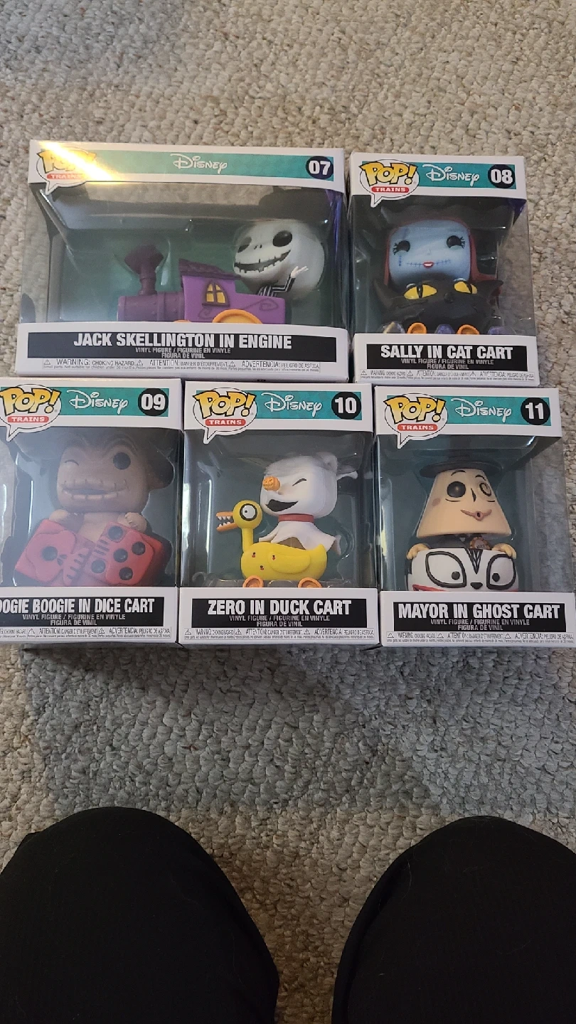 73Selling a complete set of Funko Pop! Disney Trains figures from The Nightmare Before Christmas collection! This includes: - Jack Skellington in Engine (07) - Sally in Cat Cart (08) - Oogie Boogie in Dice Cart (09) - Zero in Duck Cart (10) - Mayor in Ghost Cart (11) Each figure comes in its original box