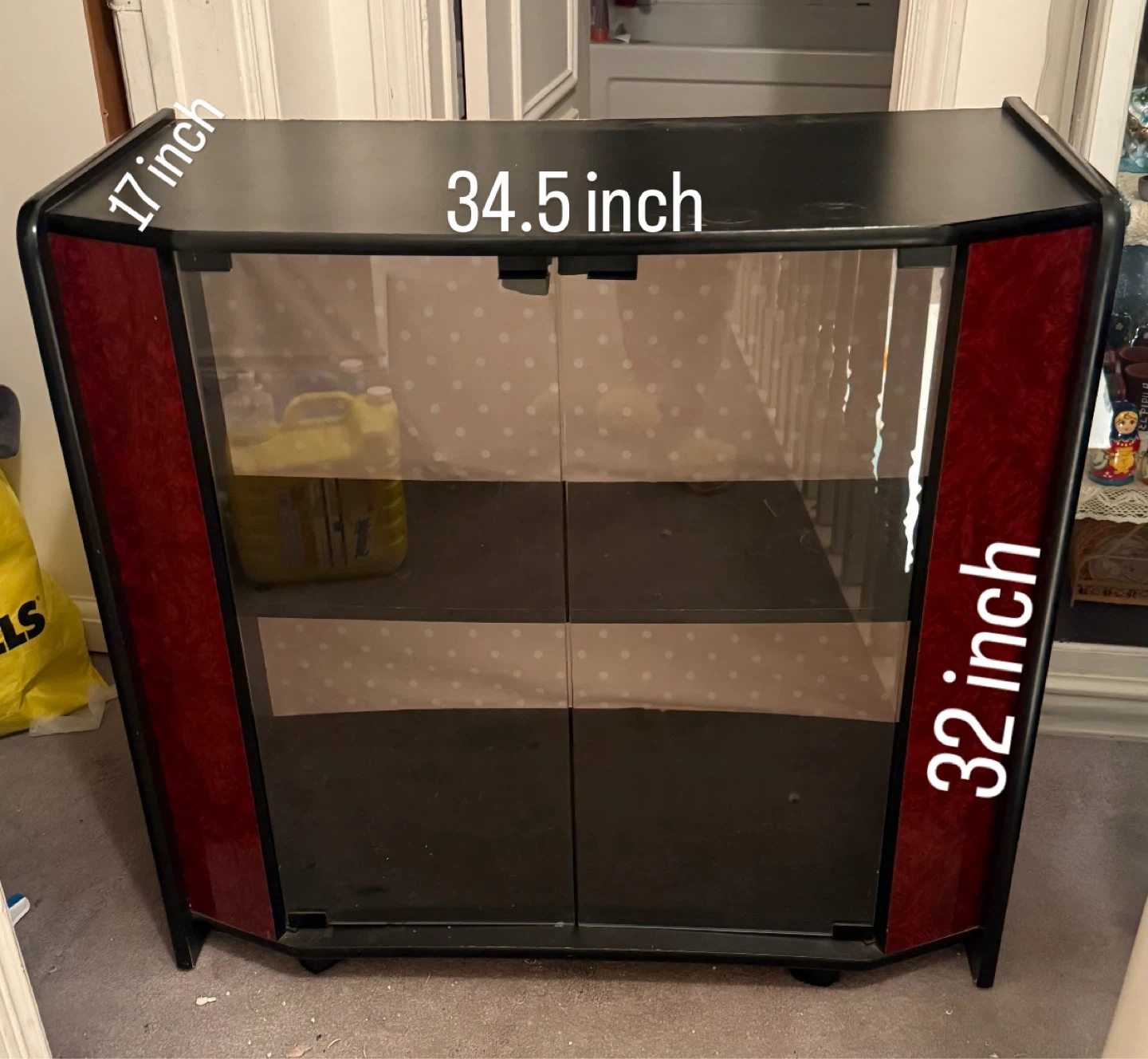 Selling a TV stand or cabinet with a black top and bottom and red sides. It measures approximately 34.5 inches wide, 17 inches deep, and 32 inches tall. It has glass doors.
