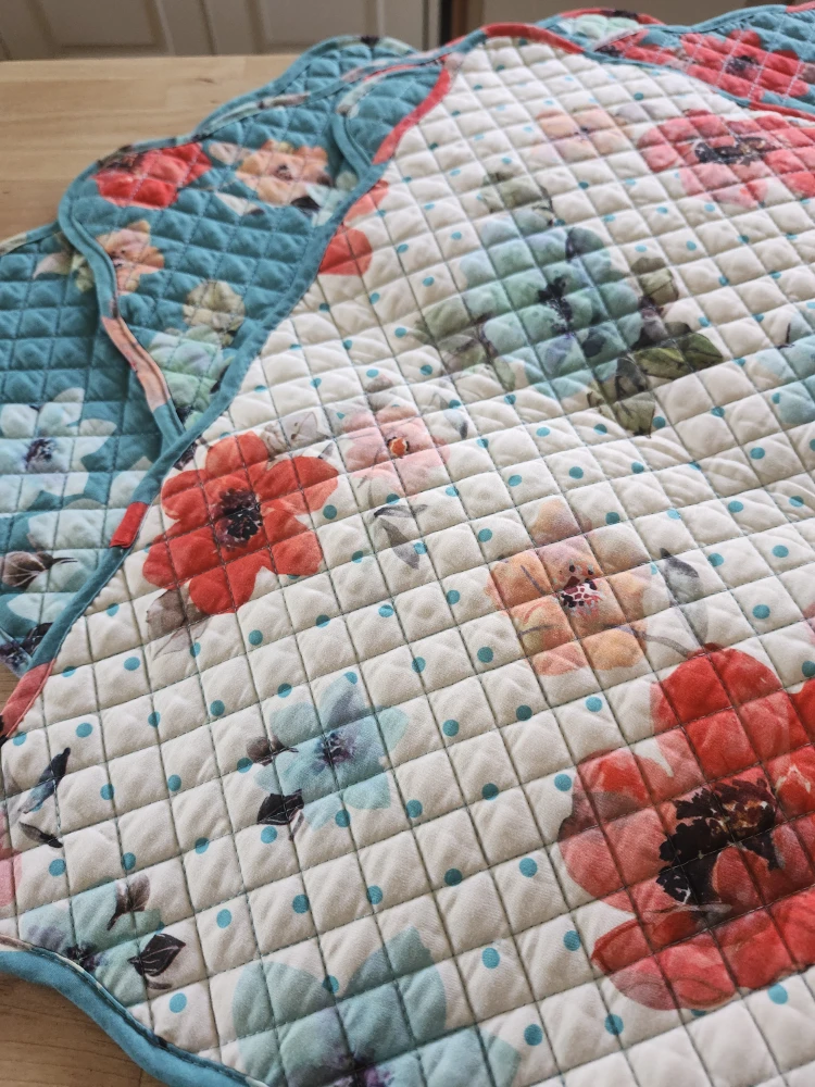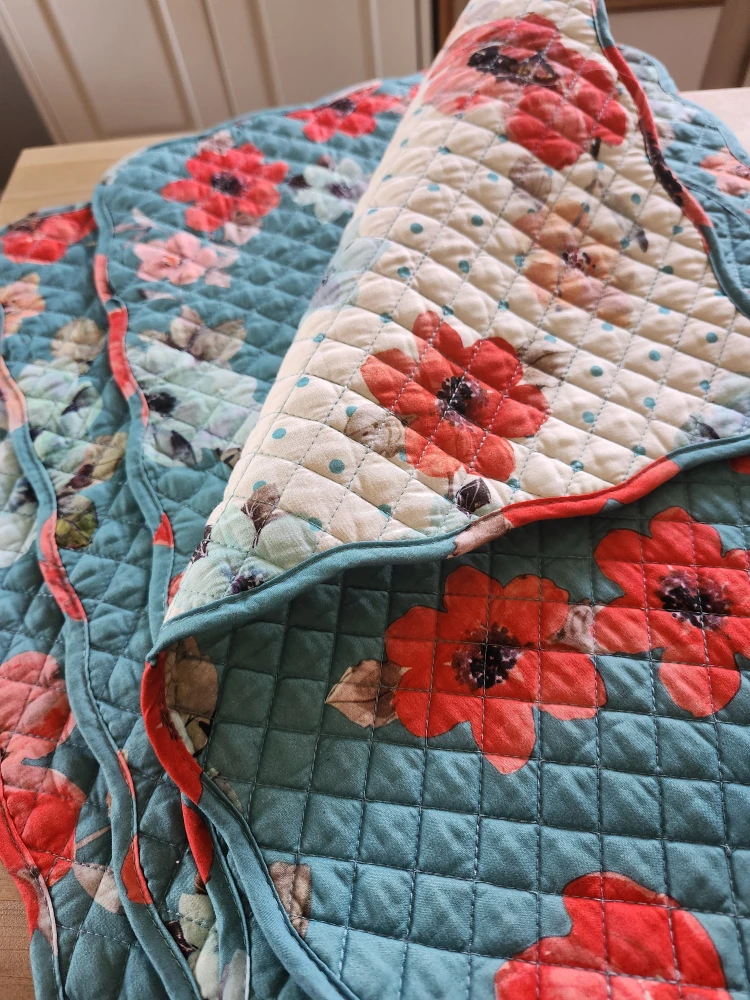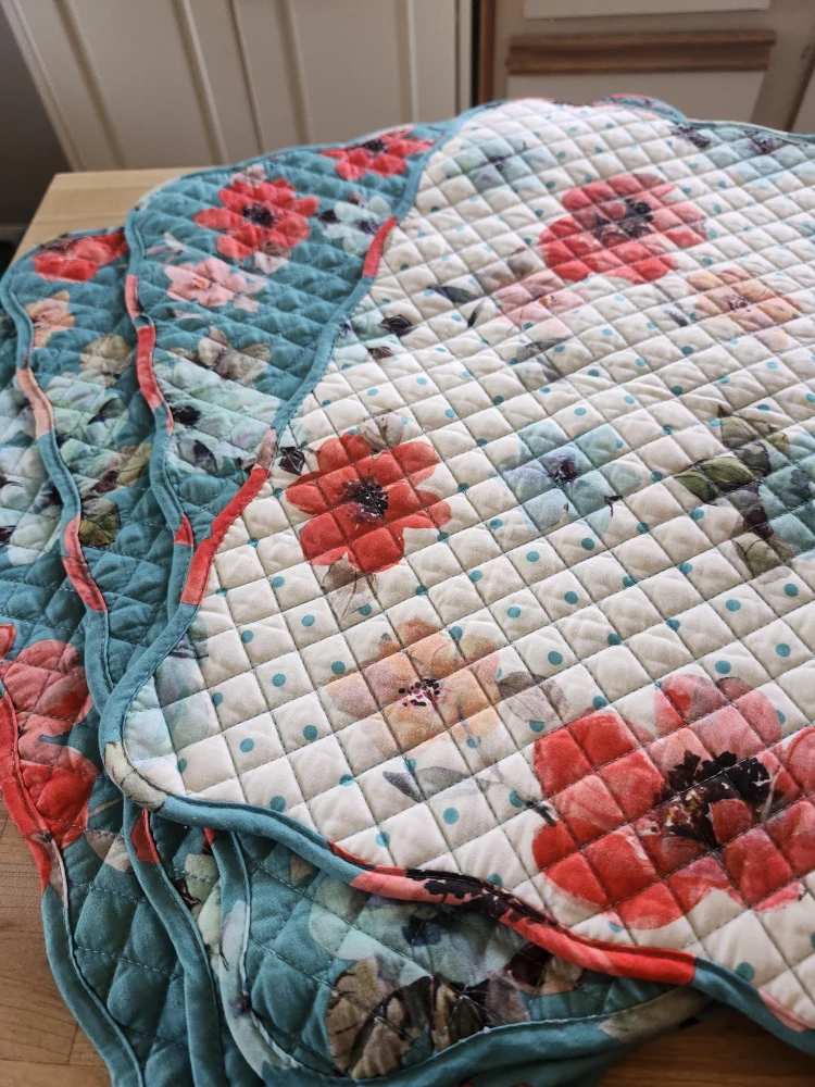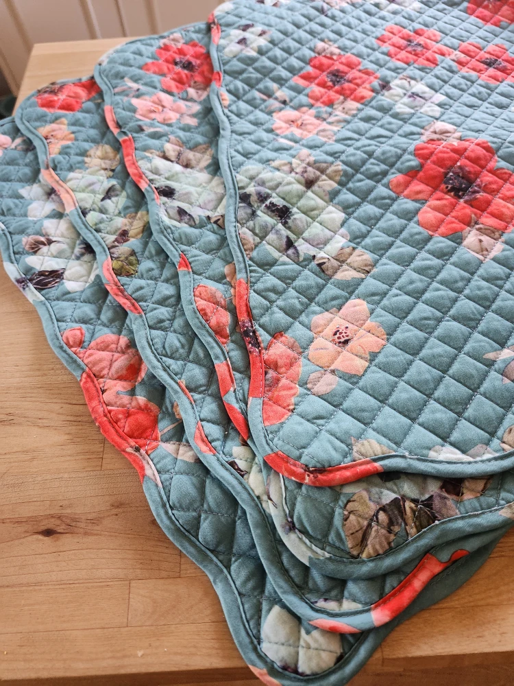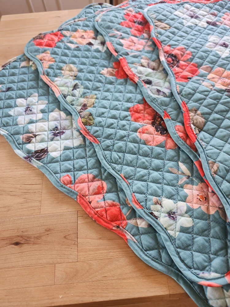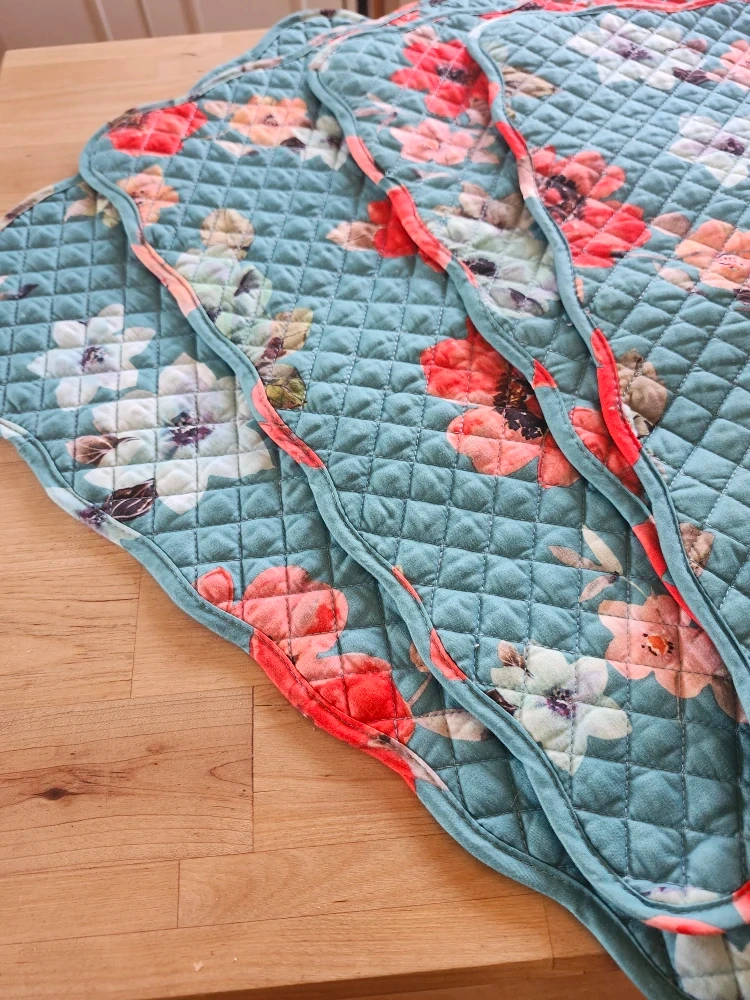 Selling a set of four quilted placemats. They feature a lovely floral pattern with red and blue flowers on a white and blue background/ reversable also. Perfect for adding a touch of charm to your dining table!