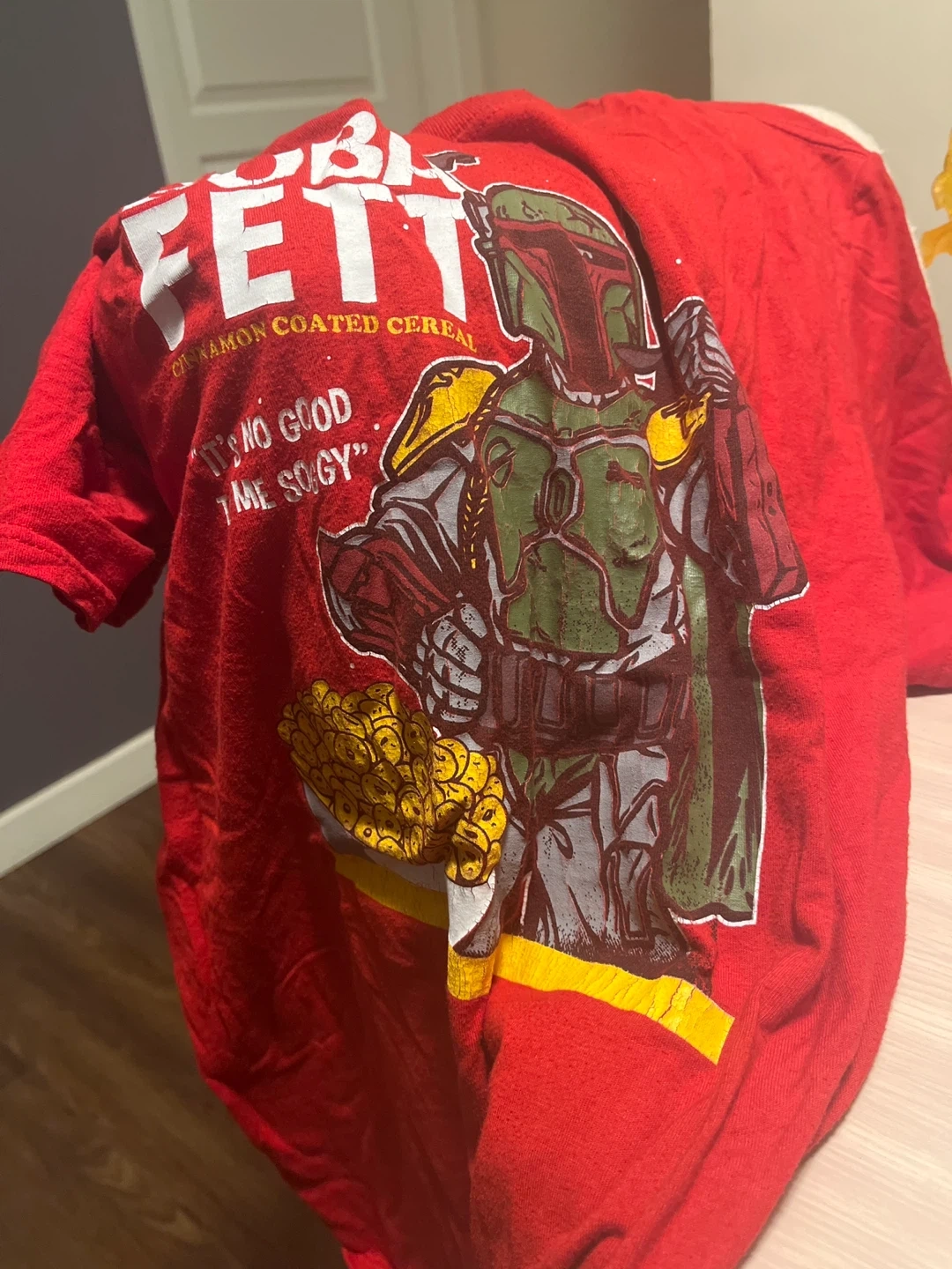 Here's a fun red t-shirt featuring Boba Fett and the words "Cinnamon Coated Cereal"! It also says, "It's no good to me soggy". A great shirt for any Star Wars fan