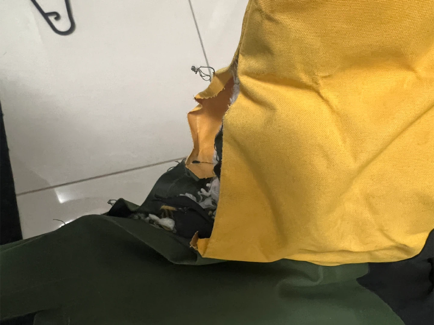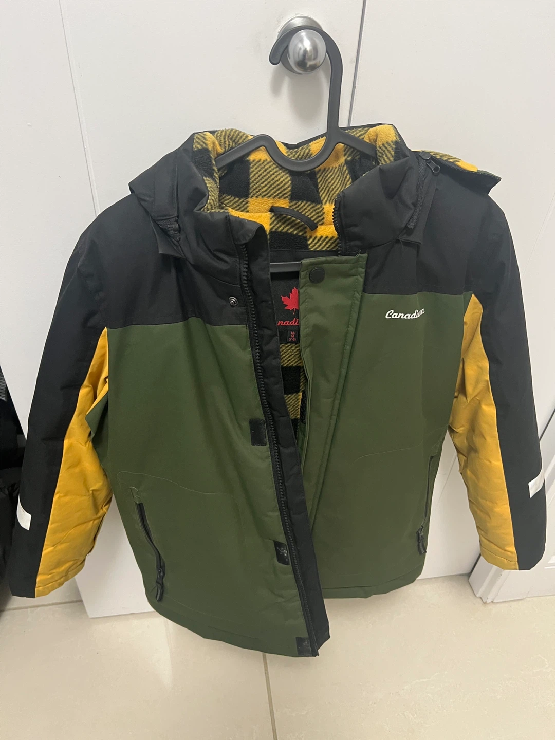 Selling a Canadiana kids' winter jacket in size M (7-8). It's green, black, and yellow with a plaid lining. Please note that there is some damage to the lining, as shown in the photos.