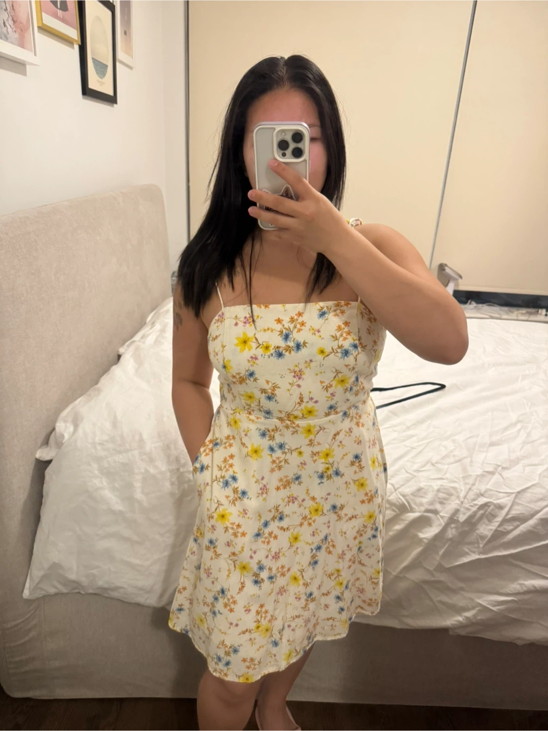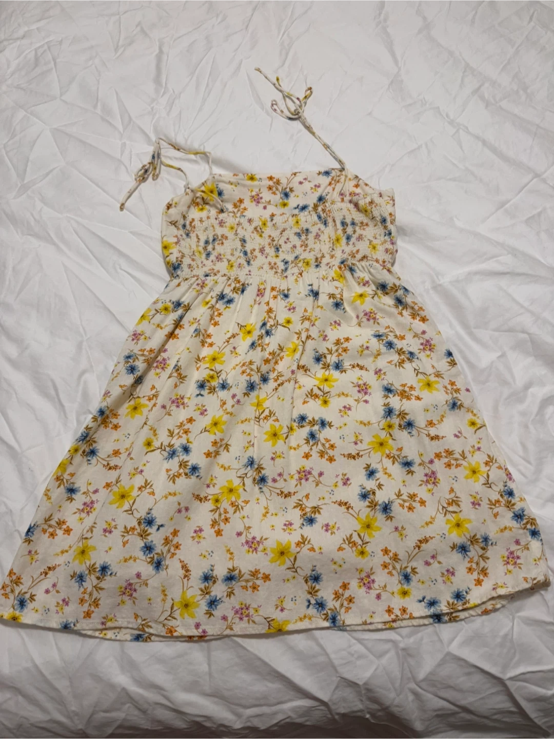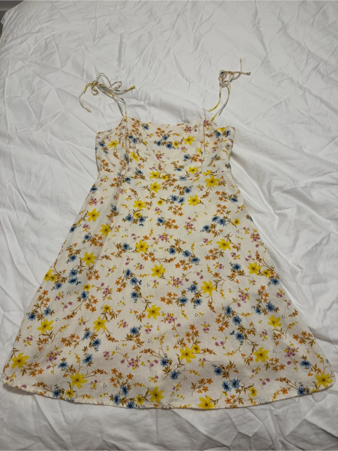 Cute floral sundress with pockets, perfect for summer! It's a size medium and features a lovely floral pattern with yellow and blue flowers. Great for a casual day out or a picnic in the park!
