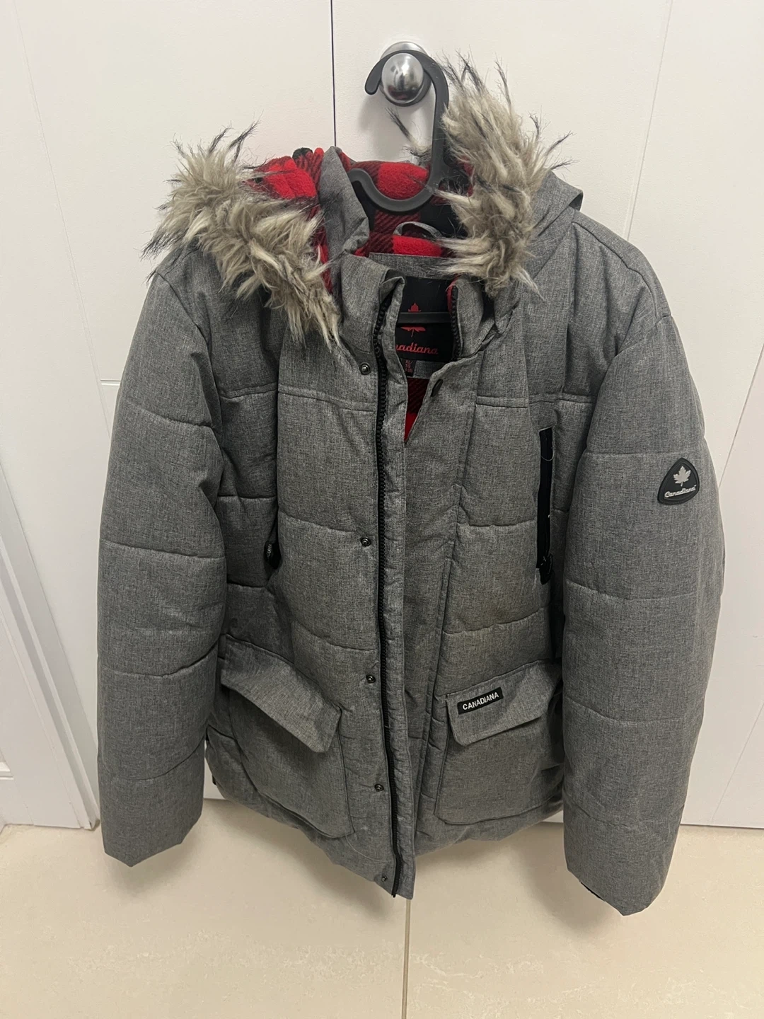 Selling a Canadiana winter jacket in size XL/TG (14-16). It's a stylish grey colour with a faux fur hood trim and a red and black plaid lining. Perfect for keeping warm this winter season!