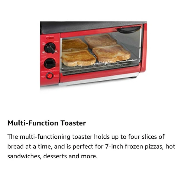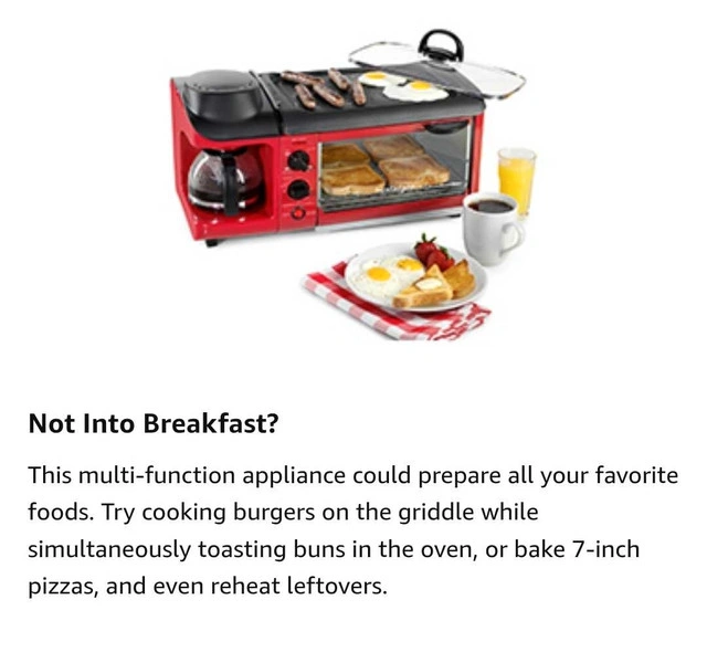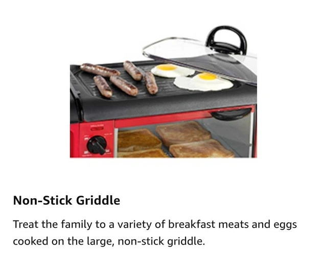 31Start your day off right with this Nostalgia 3-in-1 breakfast station that includes a coffee maker, toaster oven, and griddle! This versatile appliance can brew up to 4 cups of coffee, toast bread, cook a personal pizza, and fry eggs, bacon, and sausage. Here are some additional features: * 4-cup coffee maker * Multi-function toaster oven * Non-stick griddle * 30 minute timer * Multiple heating modes * Removable drip tray ***Brand New***