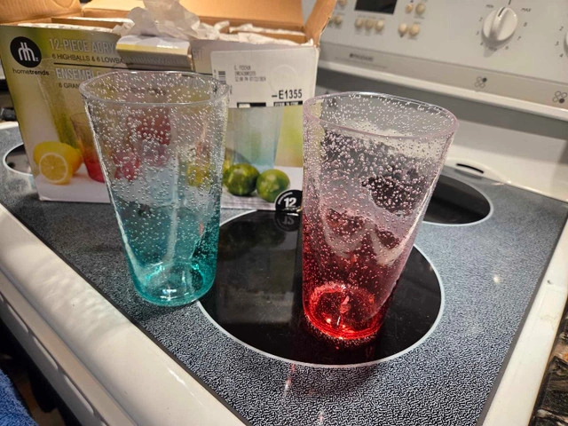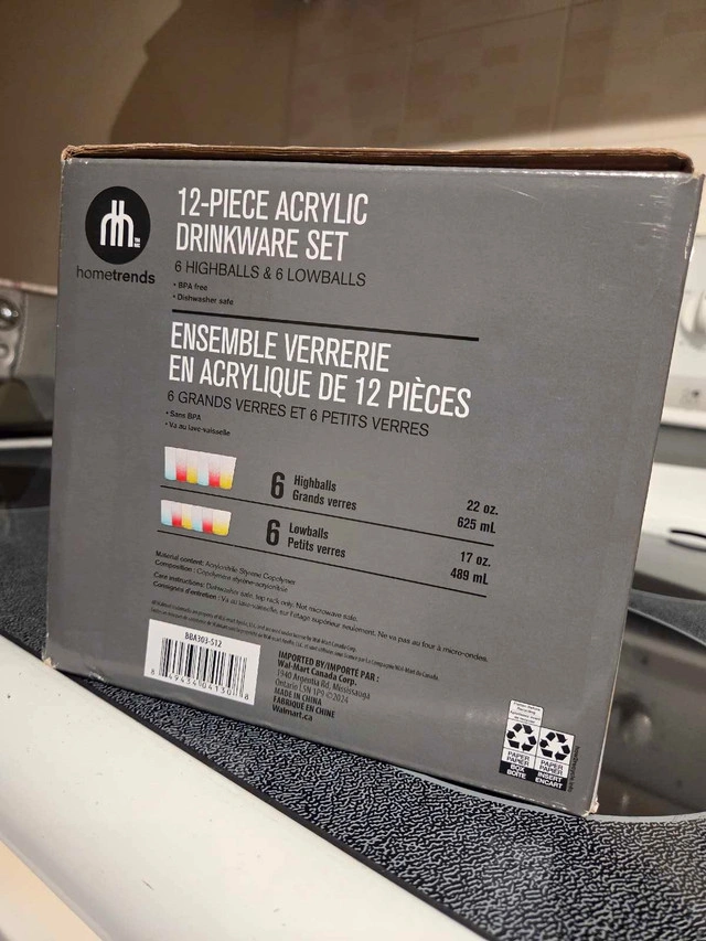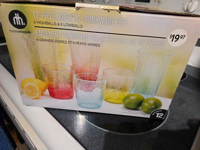 31I'm selling a new 6-piece Homtrends acrylic drinkware set, perfect for adding a splash of colour to your table! This set includes 6 highball glasses (22 oz) all BPA-free and dishwasher safe. * BPA free * Dishwasher safe * 6 Highball glasses (22oz) Add a little whimsy to your drinkware collection! And remember, if the ad's up, it's still available! I have 2 boxes for $10 each