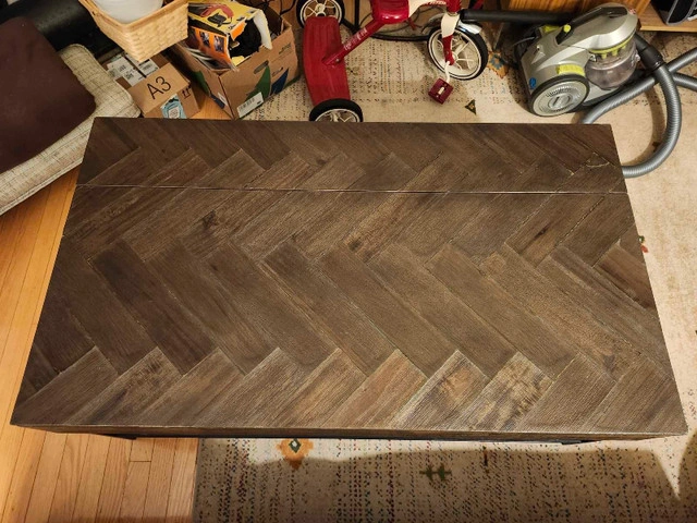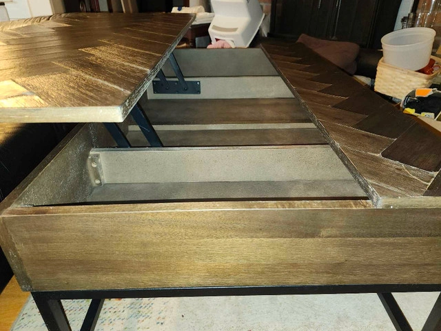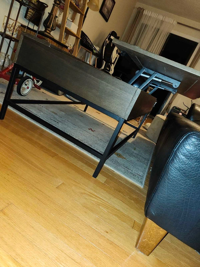 Modern coffee table with raising table top and storage space on the inside with metal legs in excellent condition for $180. Dimensions: 26" x 46" and 19.25" tall.