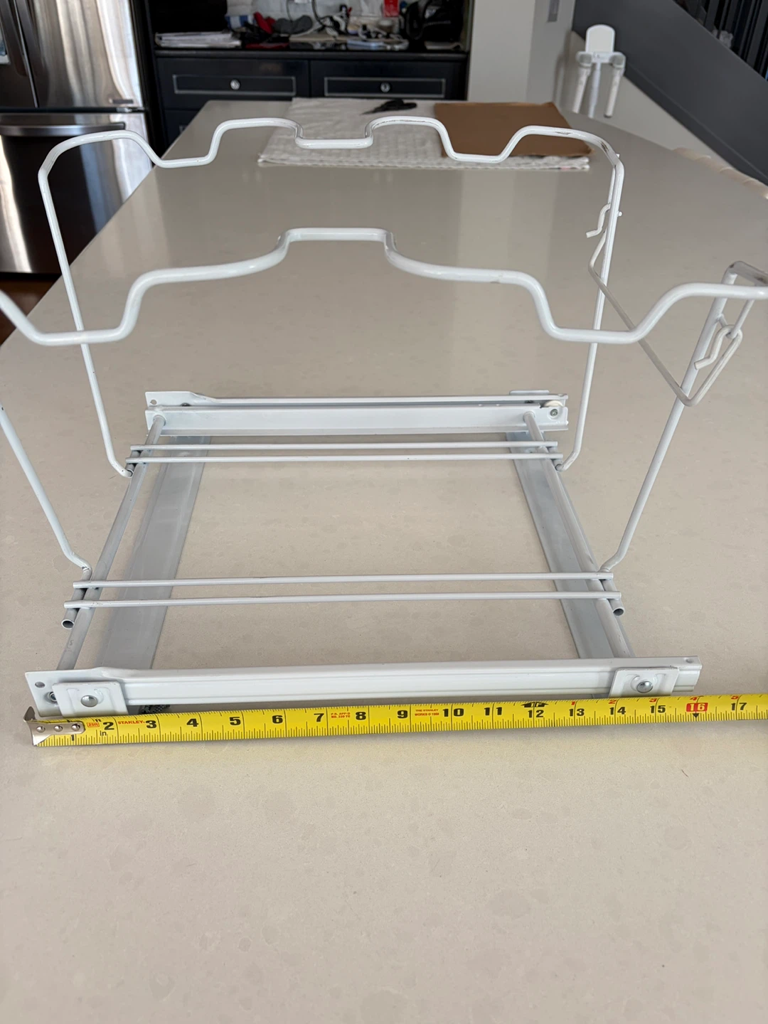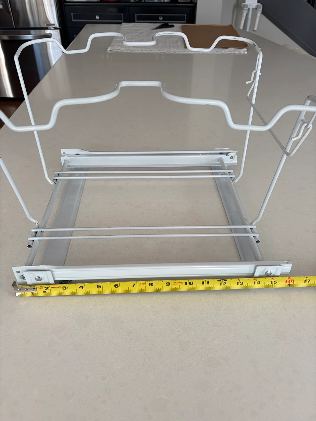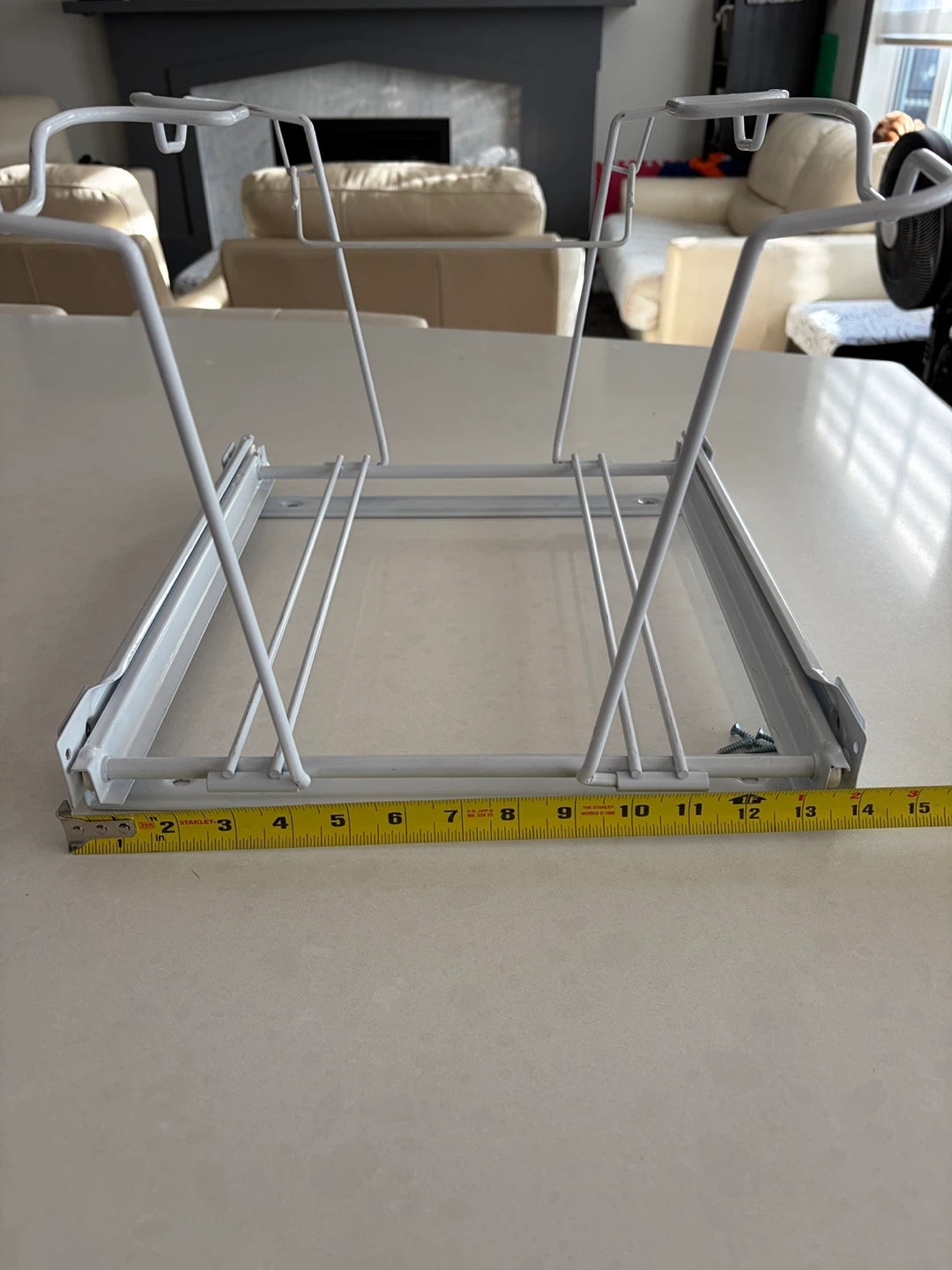This gently used pull out organizer is perfect for maximizing space in your kitchen or bathroom cabinets! Measuring 16.5" x 14.5" x 11", it's a convenient way to keep items organized and easily accessible.