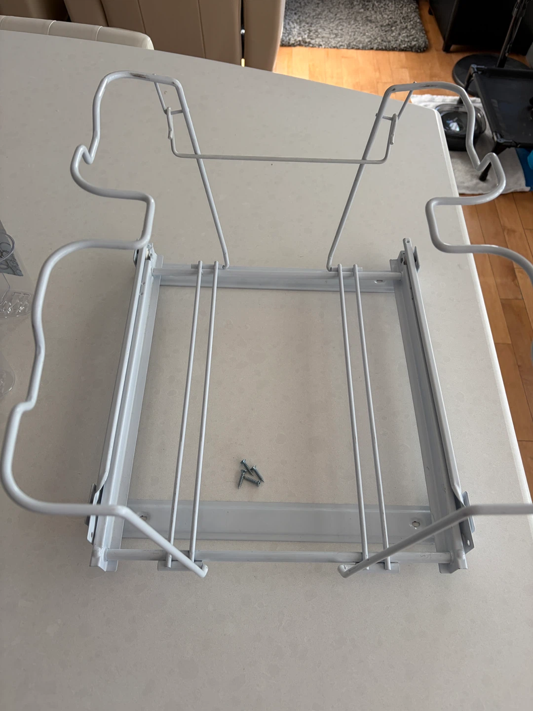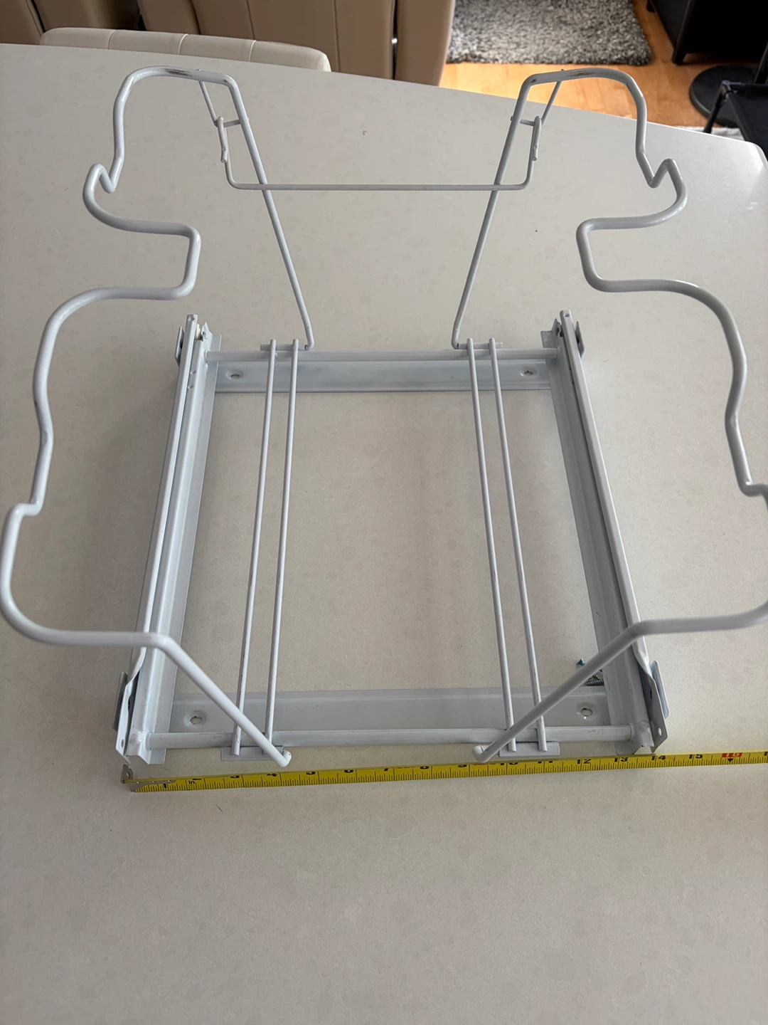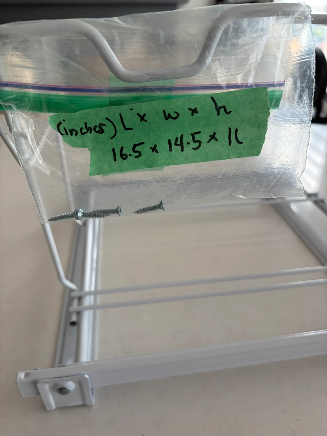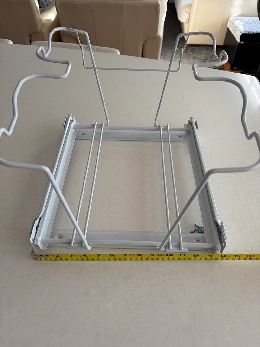 This gently used pull out organizer is perfect for maximizing space in your kitchen or bathroom cabinets! Measuring 16.5" x 14.5" x 11", it's a convenient way to keep items organized and easily accessible.
