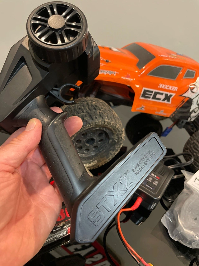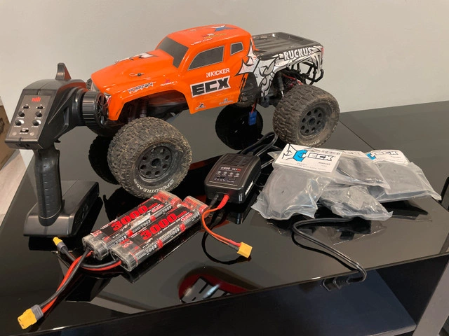 15ECX ruckus remote control truck. Comes with the transmitter (controller) STX2 Two battery packs - venom 3000mAh Charger - e450 SkyRC Extra parts. Note: Sold as is or for parts, as I have not tested it. If the ad is up, I still have it.