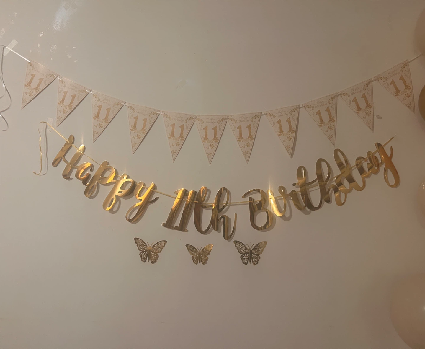 Selling a party decoration set for an 11th birthday. ‘Happy 11th Birthday' banner, and butterfly decorations. Perfect for making a birthday celebration extra special!