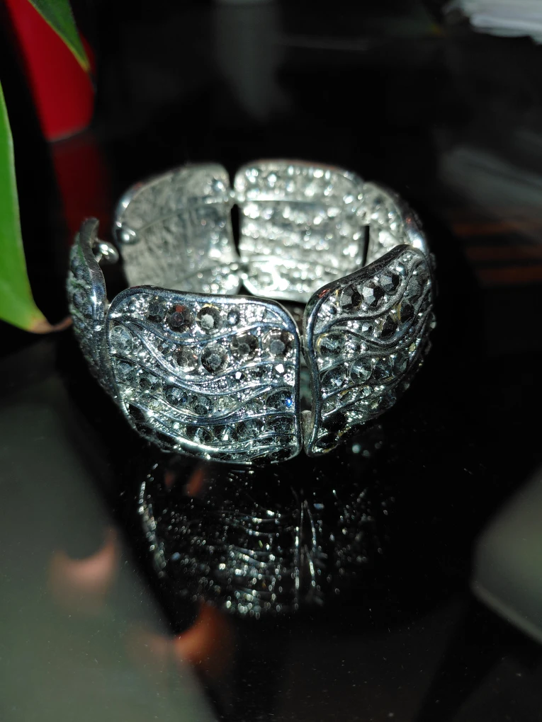 This is a silver-tone bracelet with rhinestone detailing! It’s in great condition and would be a lovely addition to any outfit