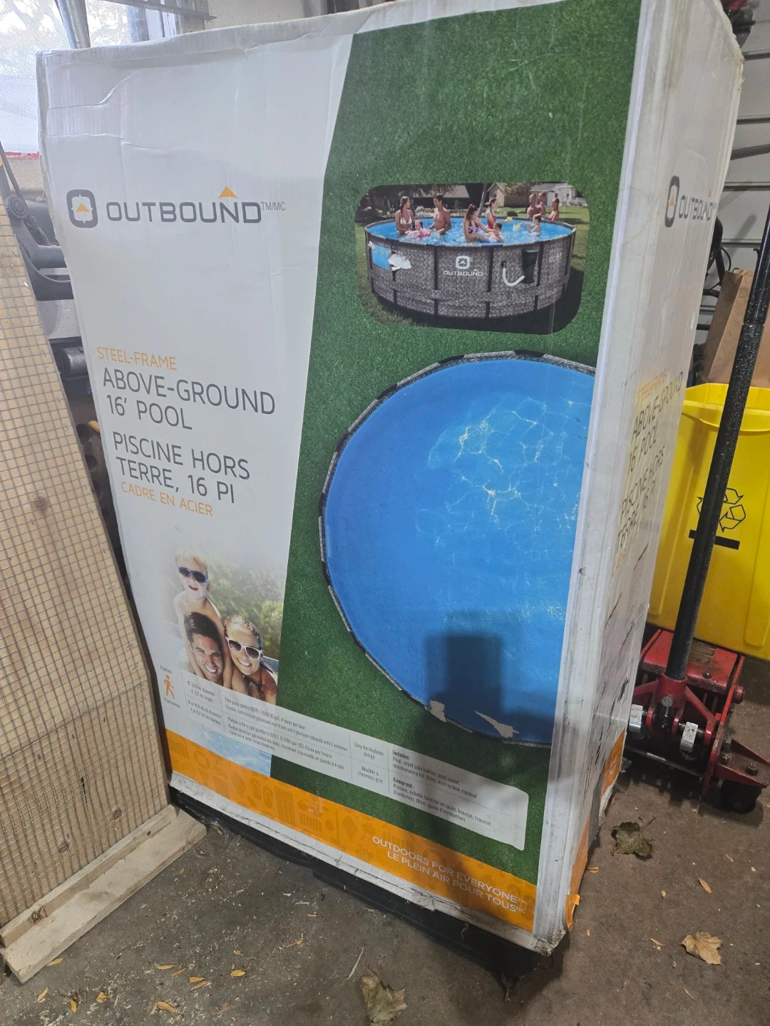 Selling a brand new, still-in-box Outbound 16-foot steel-frame above-ground pool! Ready for summer fun, this pool is perfect for families. Get ready to enjoy the warm weather with this easy-to-assemble pool