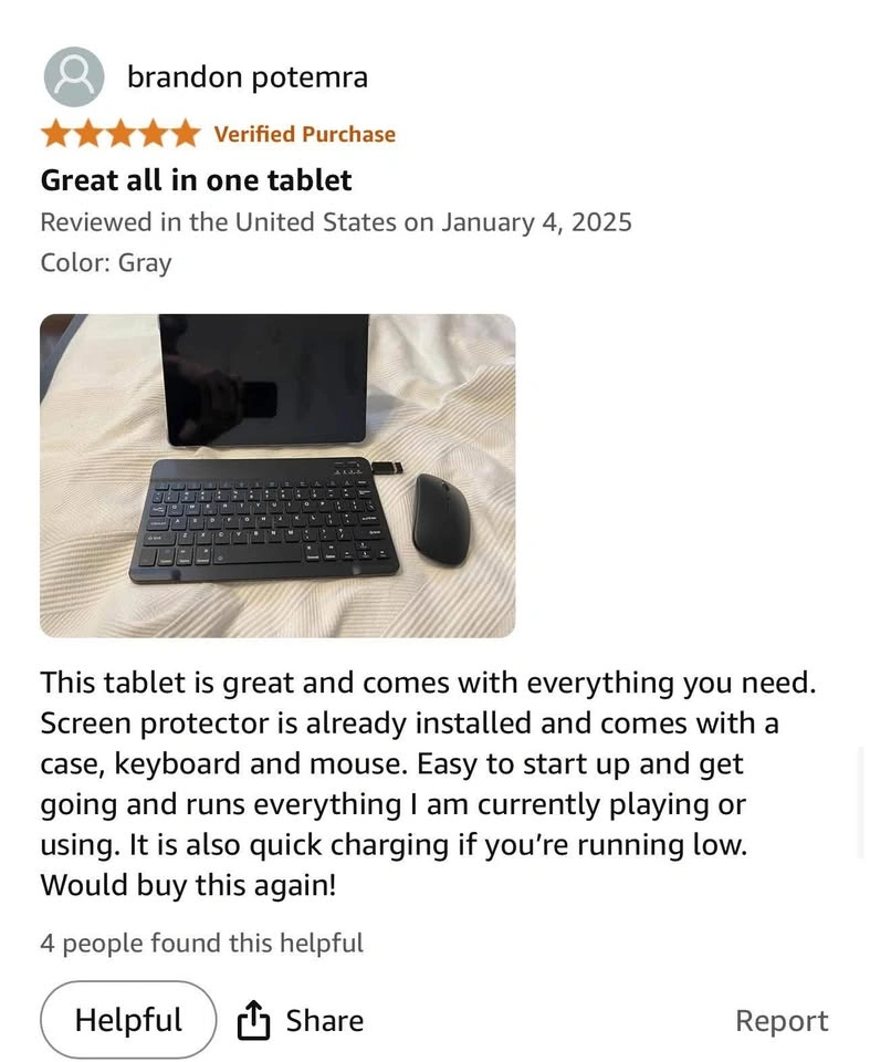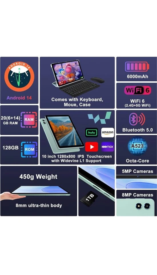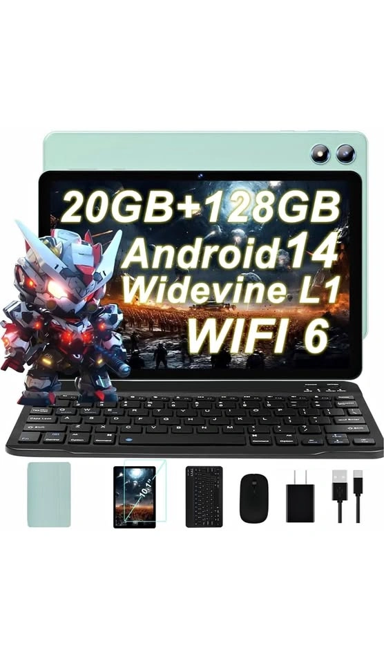 Brand new 2025 Android 14 Tablet with 20GB RAM, 128GB ROM, and 1TB expandable storage. 10-inch Octa-Core with 5G WIFI 6. Comes with wireless Keyboard, Mouse, Case, screen protector, 6000mAh Battery, HD IPS Display, Widevine L1, Split Screen.