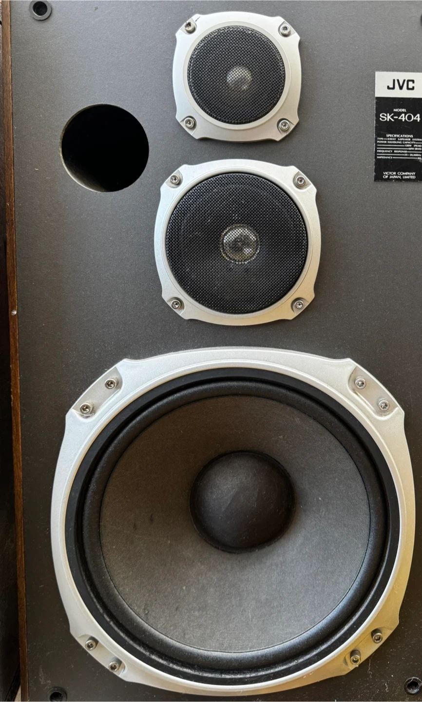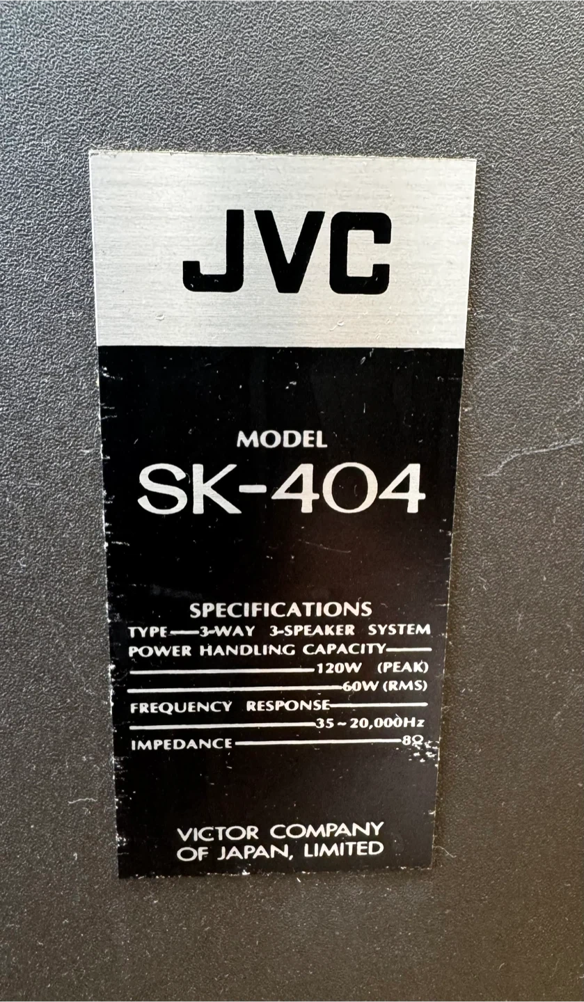 Selling a JVC SK-404(C) speaker system. This is a 3-way speaker system with a 12" woofer and a 2 1/2" tweeter. It has a power handling capacity of 120W (peak) and 60W (RMS). The impedance is 8 ohms and the frequency response is 35-20,000 Hz