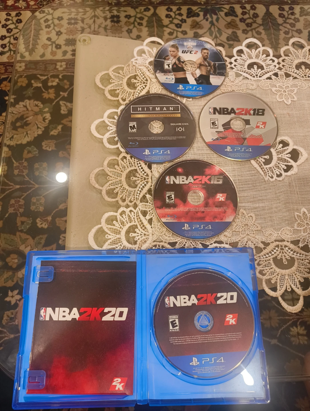 Selling a collection of PS4 games including NBA 2K16, NBA 2K18, NBA 2K20, UFC 2, and Hitman: The Complete First Season and only 2k20 has case with manual and the rest of them are only discs