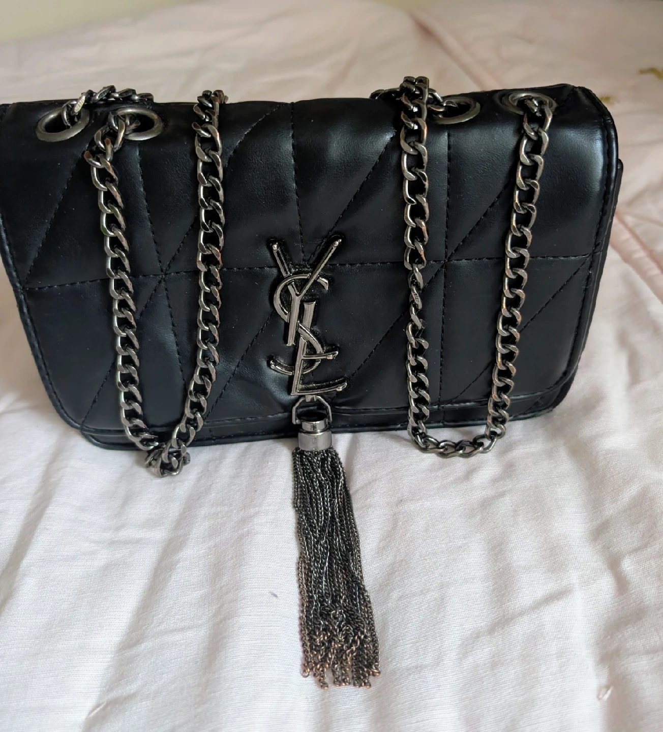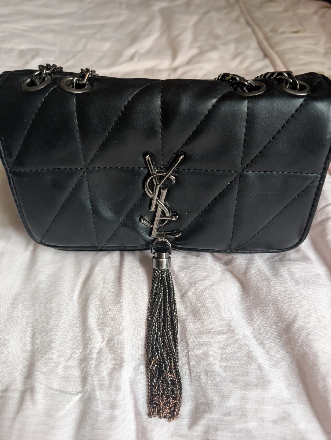 994Selling a stylish Saint Laurent (YSL) black quilted leather bag! It features a chic chain strap and the iconic YSL logo. It's in great condition and ready for a new home!