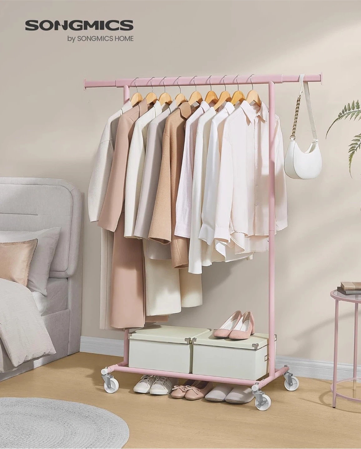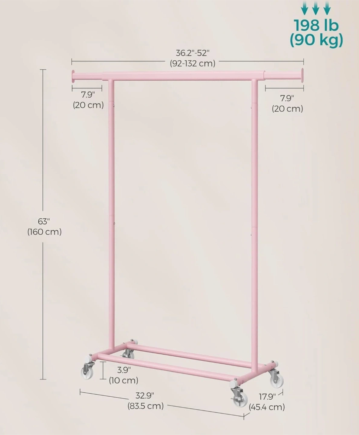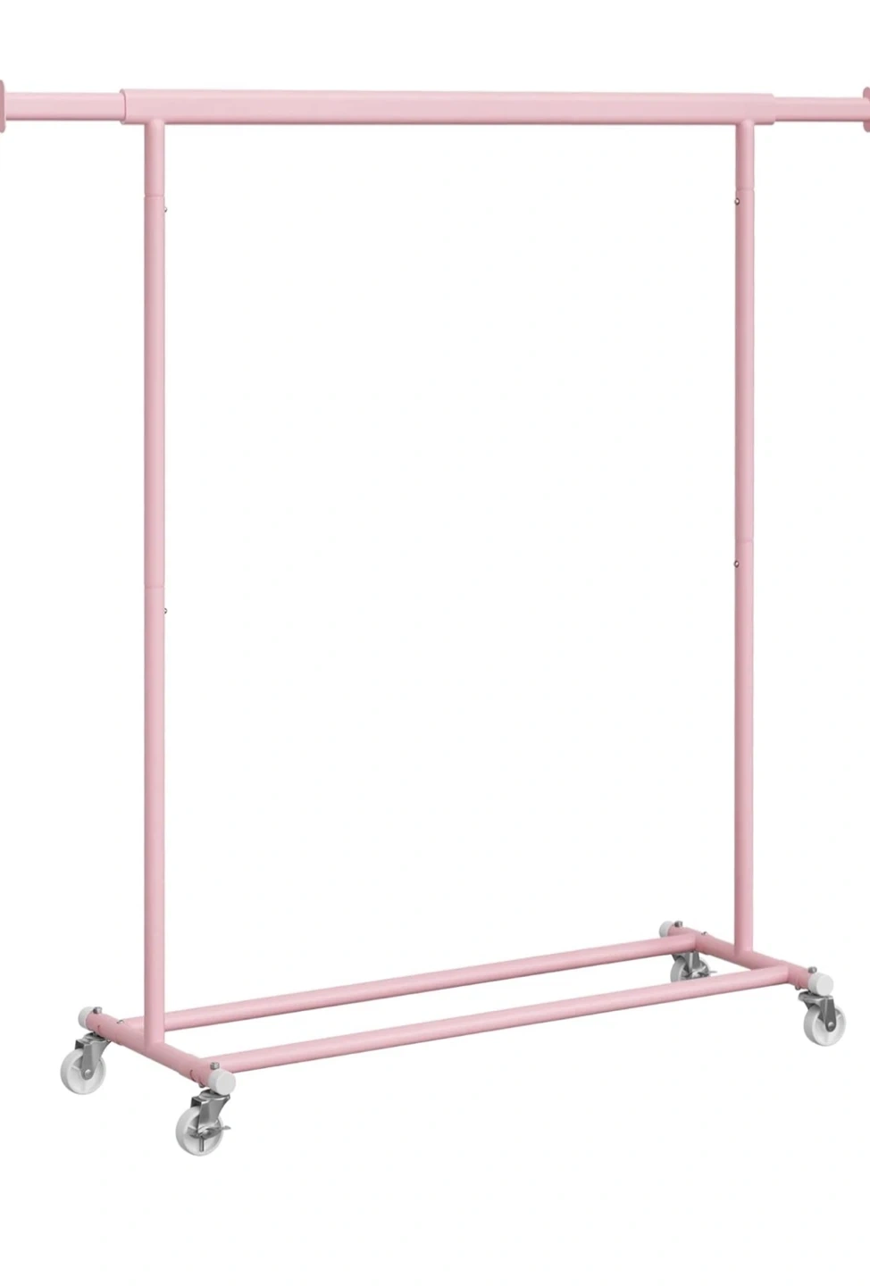 226Selling a SONGMICS clothes rack in pink! It's extendable, so you can adjust the width from 36.2" to 52" (92-132 cm). It also has wheels, making it easy to move around your space. The height is 63" (160 cm).