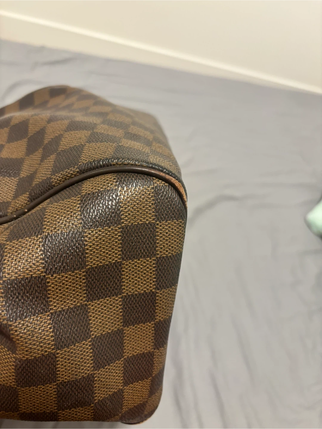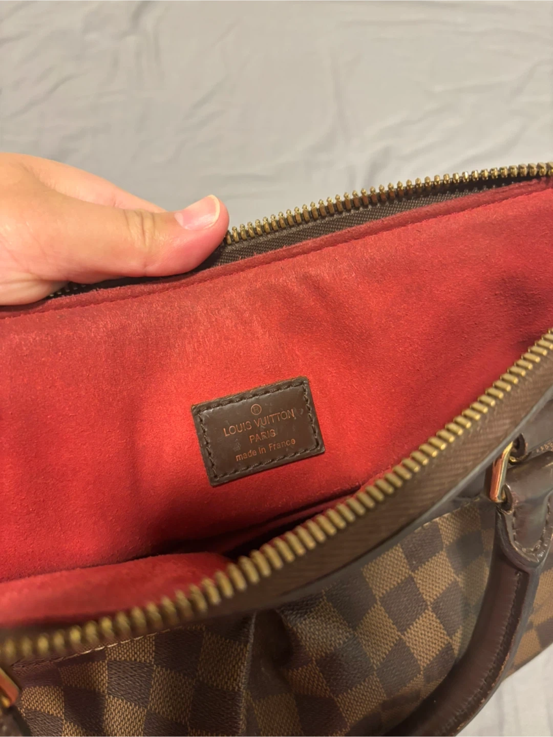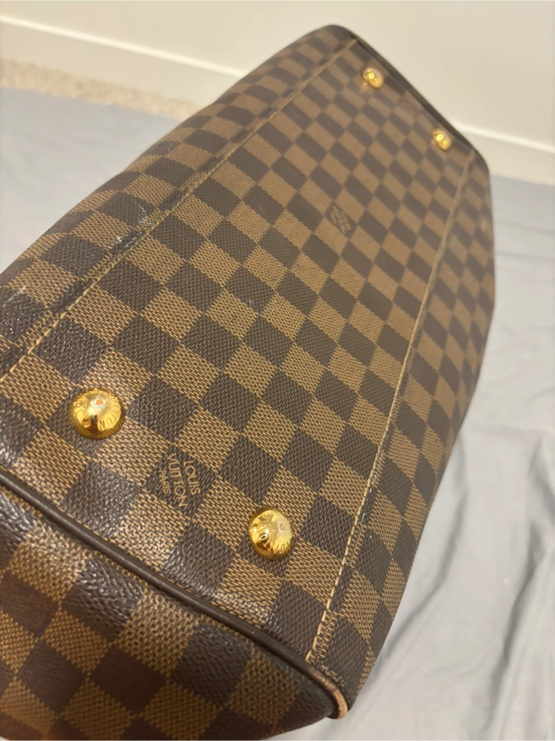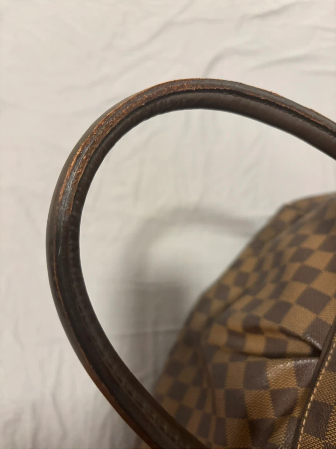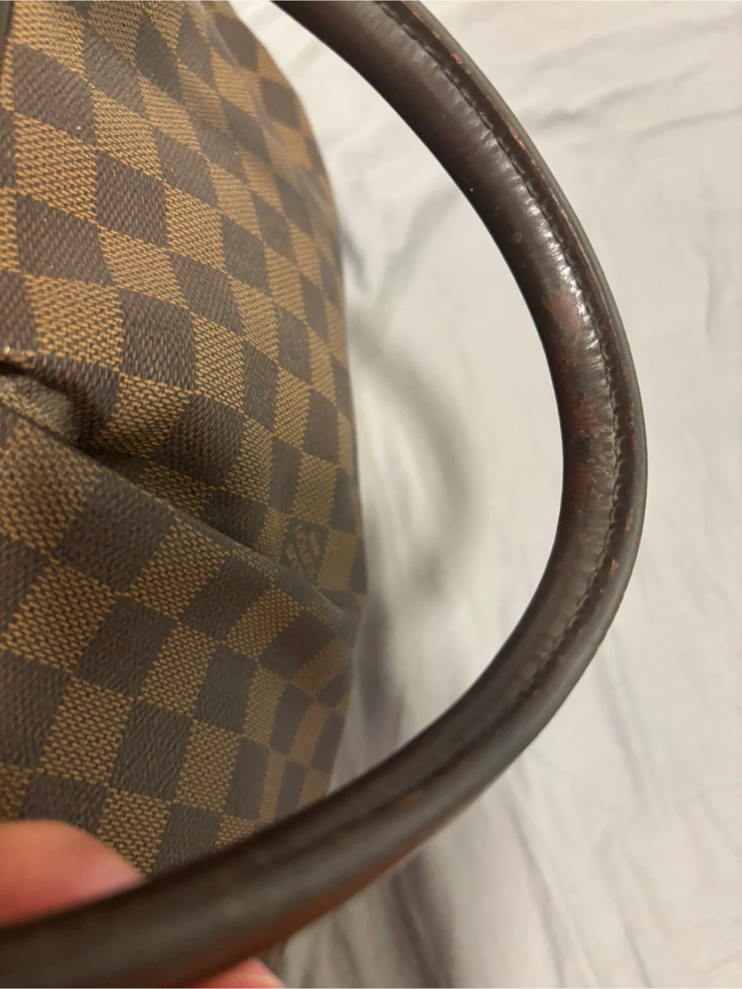 Selling a Louis Vuitton Damier Ebene Hampstead handbag. It's a beautiful bag with the classic LV checkered pattern. Please note that there are some signs of wear on the handles and zipper pull, as shown in the photos.