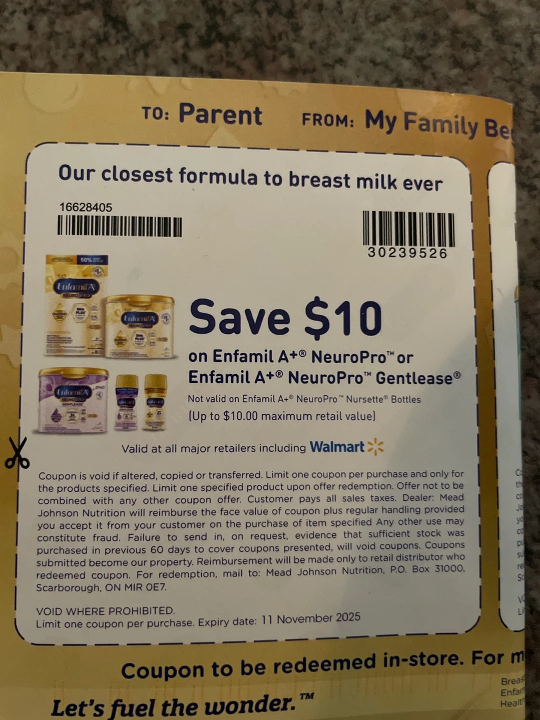 I have a coupon for $10 off Enfamil A+ NeuroPro or Enfamil A+ NeuroPro Gentlease! It's valid at major retailers, including Walmart. Coupon expires November 11, 2025,