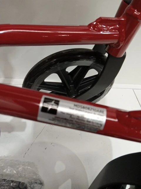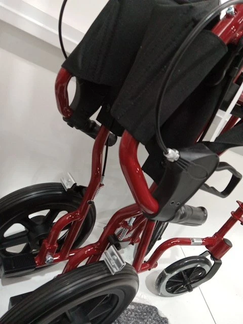 This Medline lightweight transport wheelchair features a 19-inch seat and a durable, red aluminum frame, offering convenient portability and assistance. This chair is new, still in it's original packaging!