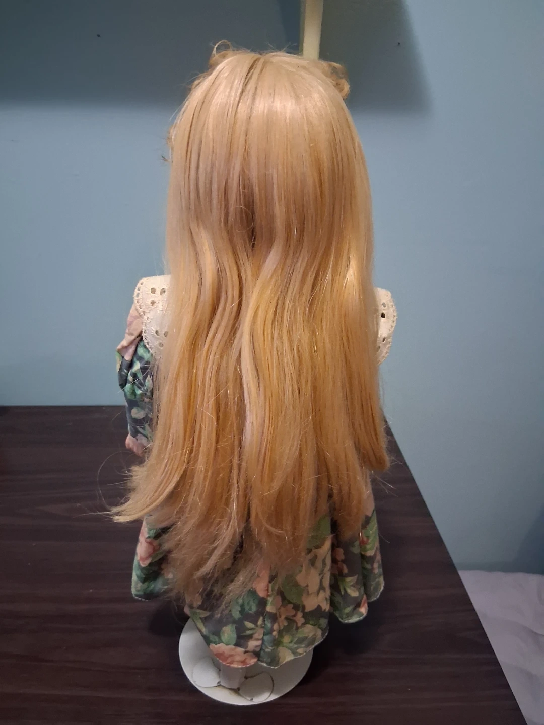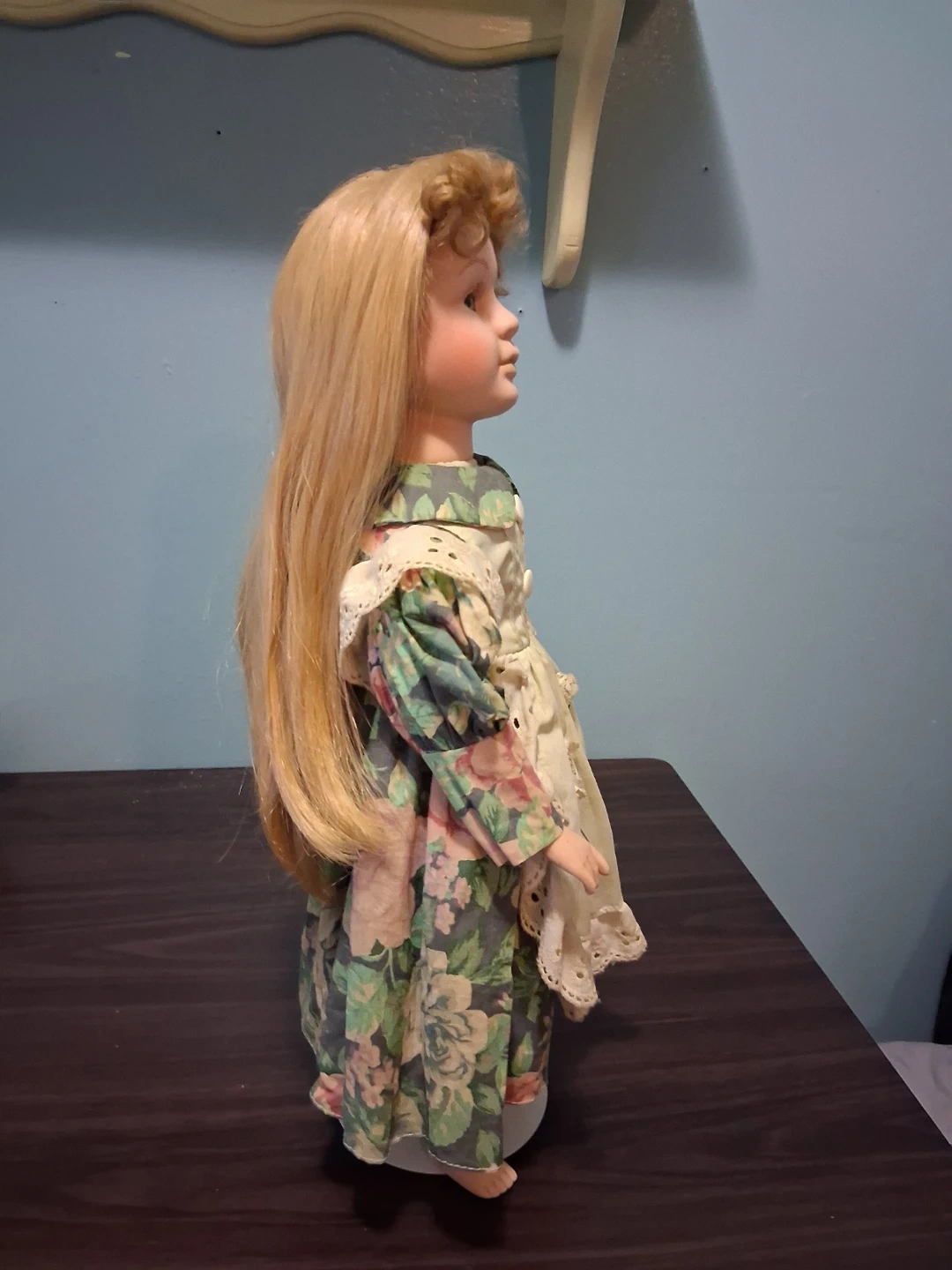549This is a beautiful porcelain doll with blonde hair and blue eyes. She is wearing a floral dress with lace trim and a white apron. The doll is in good condition and would be a great addition to any collection