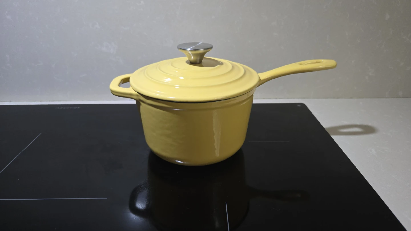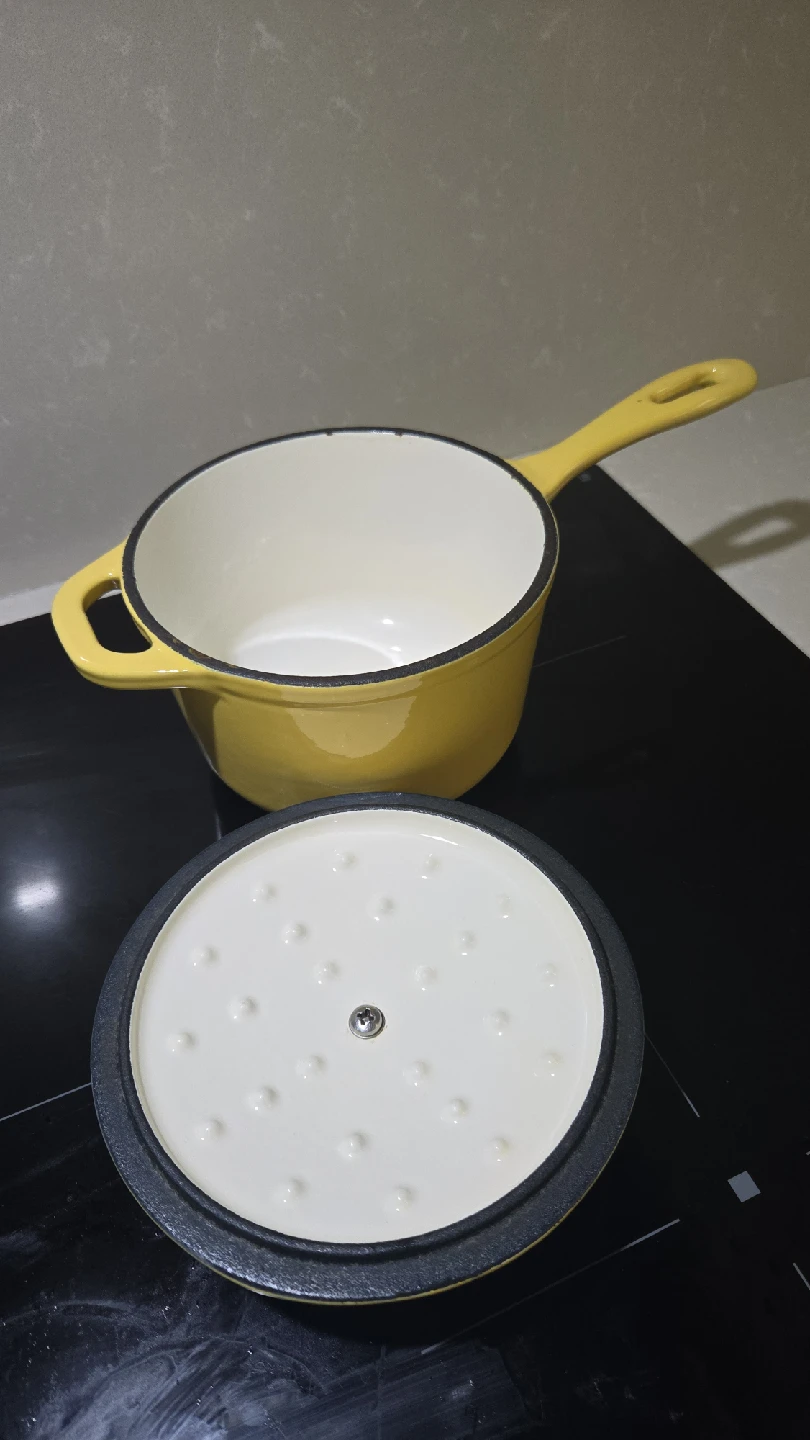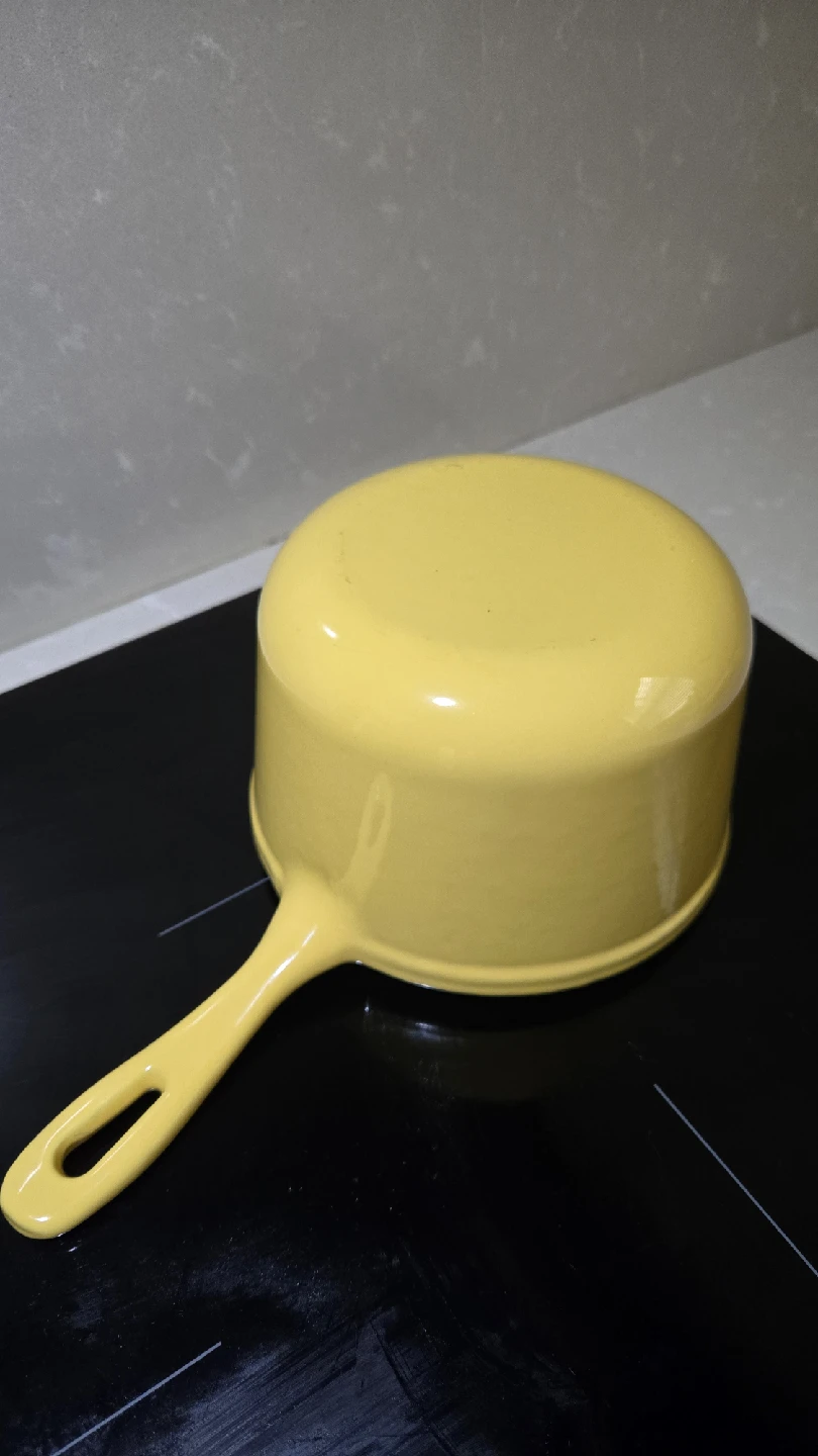 Here's a bright yellow cast iron saucepan, perfect for cooking up your favourite sauces or small meals. It comes with a matching lid. The interior has a small chip- see images. Not sure what from- it was always hand washed.