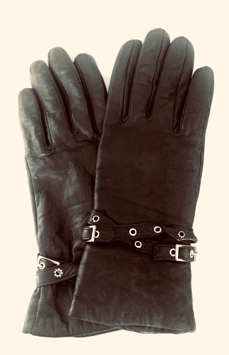 Selling a pair of Kenneth Cole Reaction leather gloves. They are a size 7.5 and feature a stylish design with buckle detailing. The gloves are made with genuine leather and have a lining that's 70% wool and 30% acrylic.