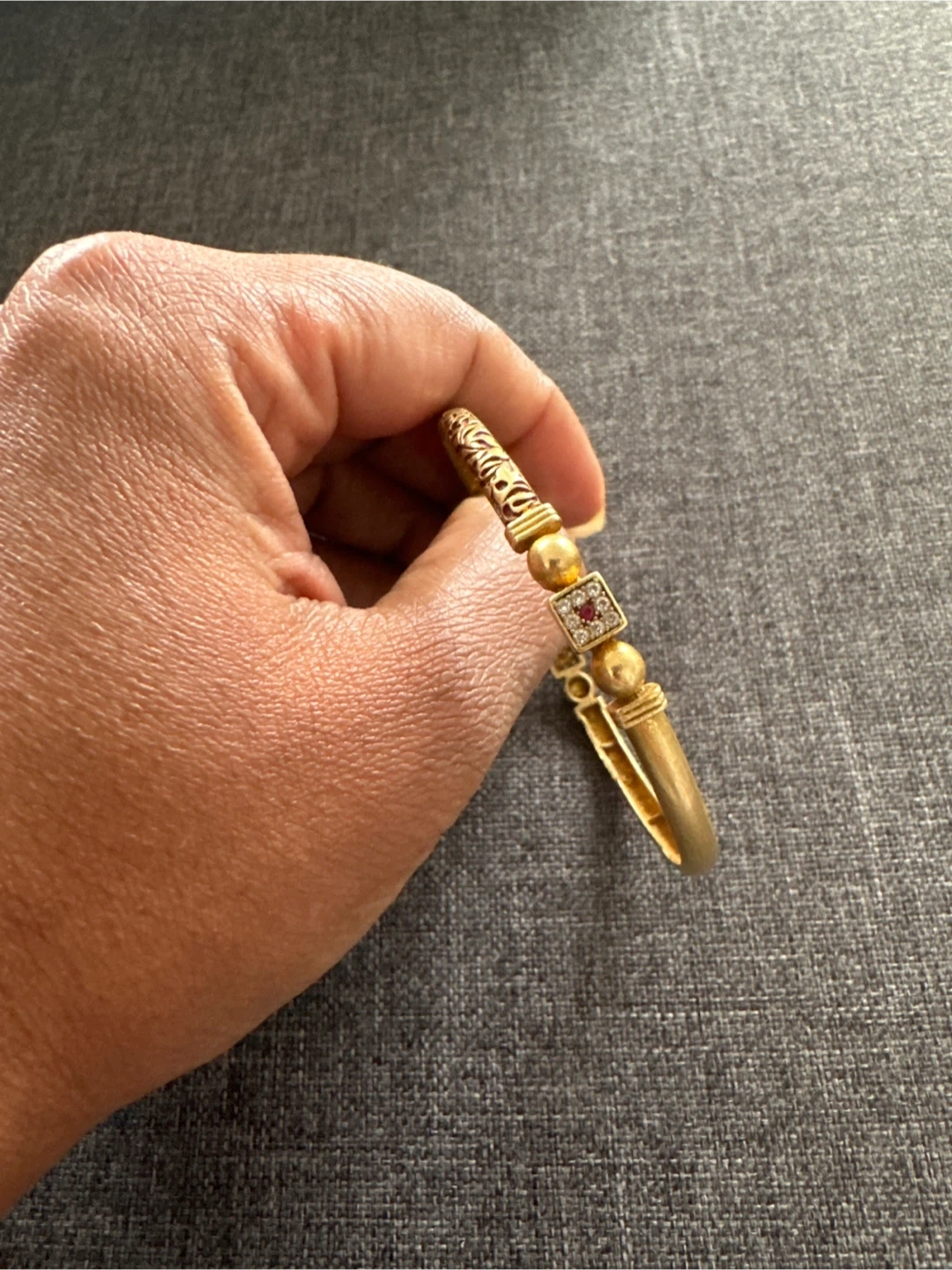 Selling a gold-tone bangle bracelet. It features an intricate design with decorative accents. A lovely piece to add to your collection!