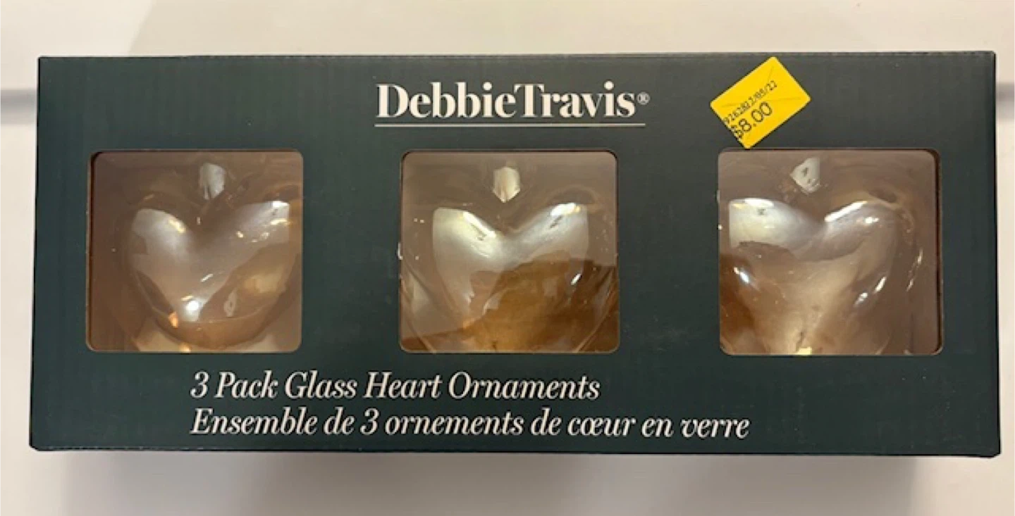 Selling a brand new set of Debbie Travis 3 Pack Glass Heart Ornaments! The ornaments are made of glass and each measure 3" / 7.6 cm. Originally bought for $8.00 🤩