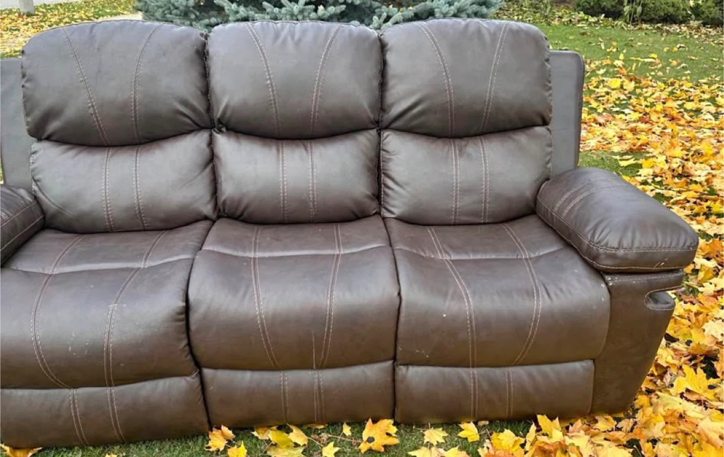Selling a comfy brown leather reclining sofa. It's a great piece for any living room to relax and unwind! The sofa shows some signs of use, but it's still in good condition and ready for a new home
