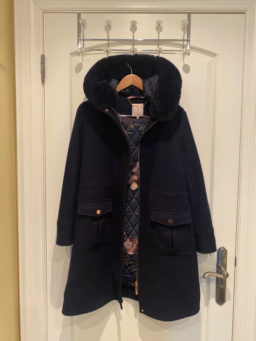 Selling a stylish Ted Baker London wool blend coat! It features a cozy faux fur hood and a beautiful quilted lining.