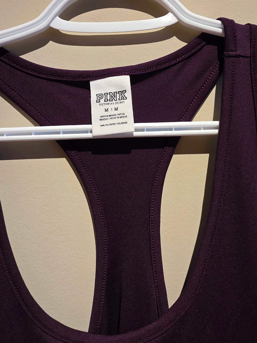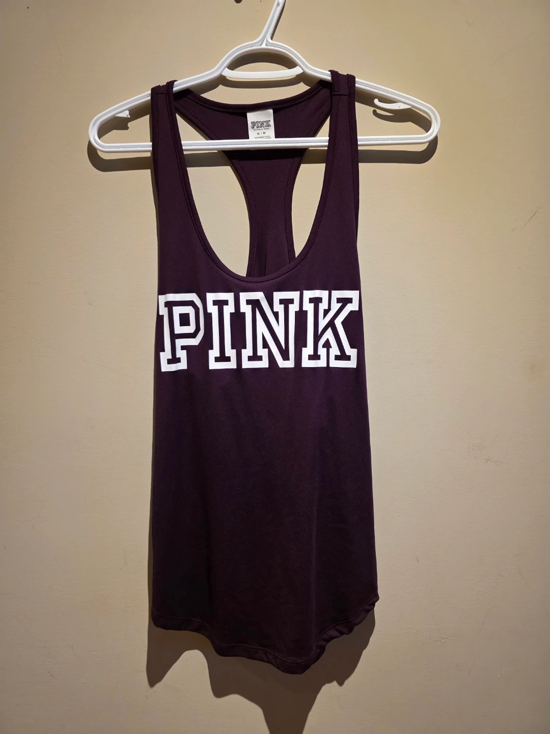 110Selling a Victoria's Secret PINK tank top in a lovely dark purple colour. It's a size medium and made of 100% polyester. Perfect for workouts or casual wear!