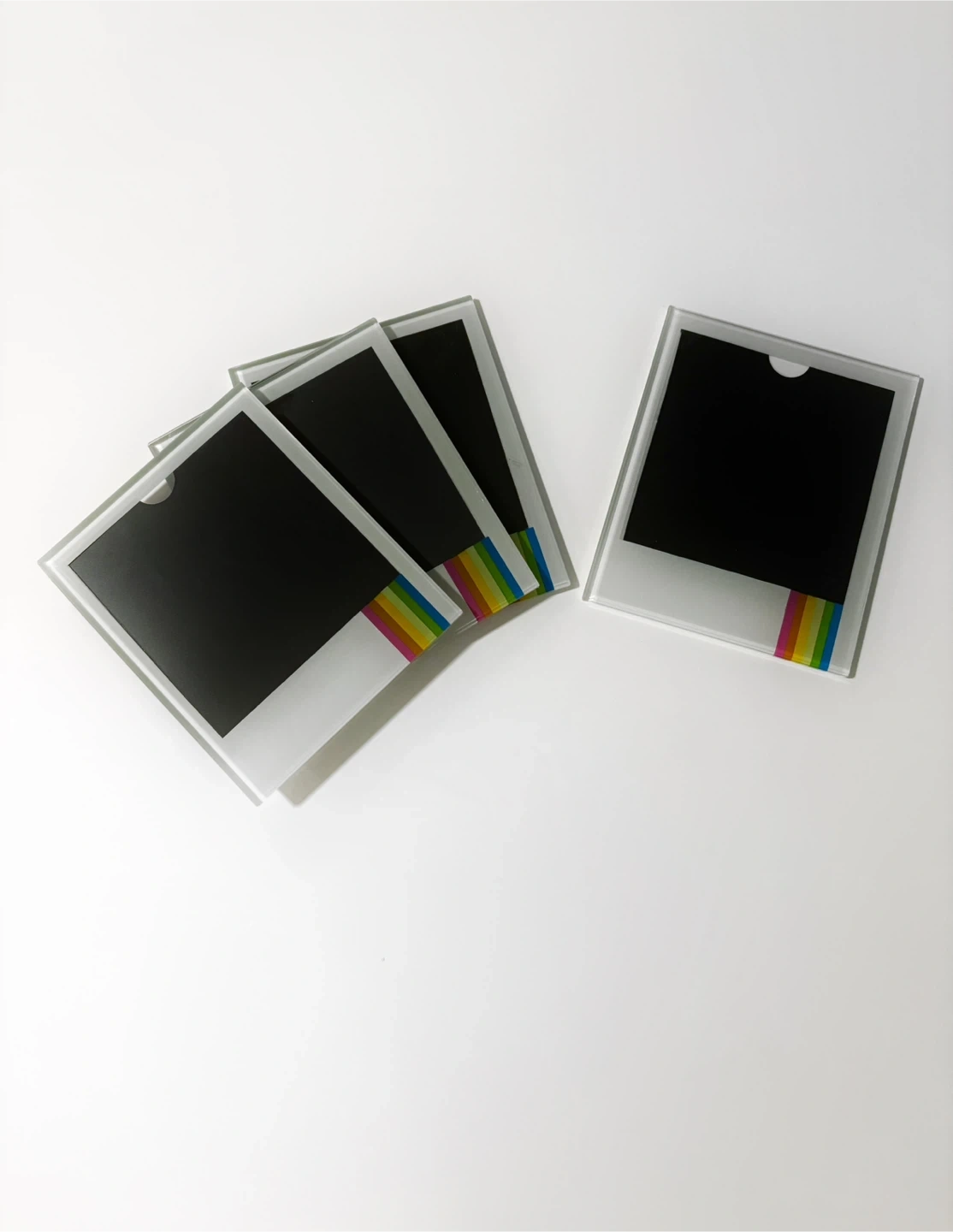 627Selling a set of 4 coasters designed to look like Polaroid photos. They have a clear glass-like frame and a colourful stripe design at the bottom. Can put in any fun photos in the back.