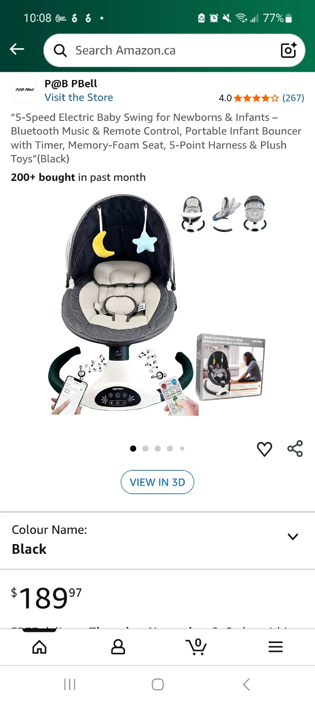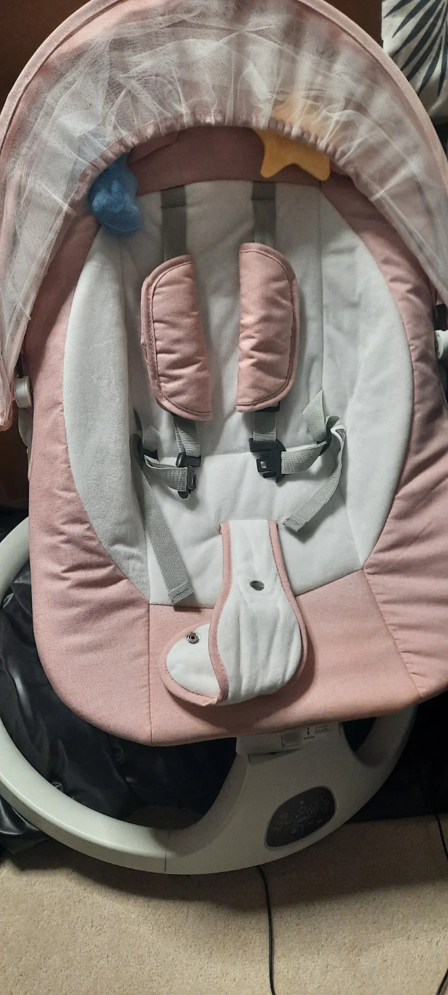 Selling a gently used P@B PBell 5-Speed Electric Baby Swing in black. It features Bluetooth music, remote control, a portable infant bouncer with timer, memory-foam seat, 5-point harness, and plush toys. Originally bought for $189.97.