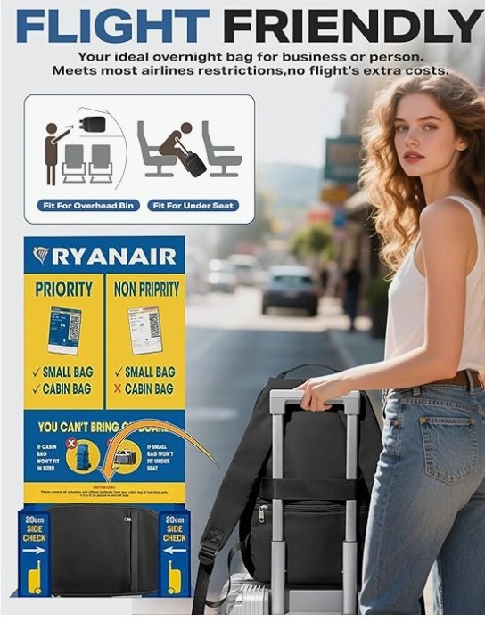 New, never used black backpack. Roomy and spacious, perfect size to meet aviation standards. It can hold multiple heavy clothes and travel items. Great option as a travel backpack, made of durable waterproof polyester fabrics with breathable fabric and mesh style padded straps. It also features a dry-wet separation design. Can be used as hybrid backpack/ duffel bag/ shoulder bag and travel bag.