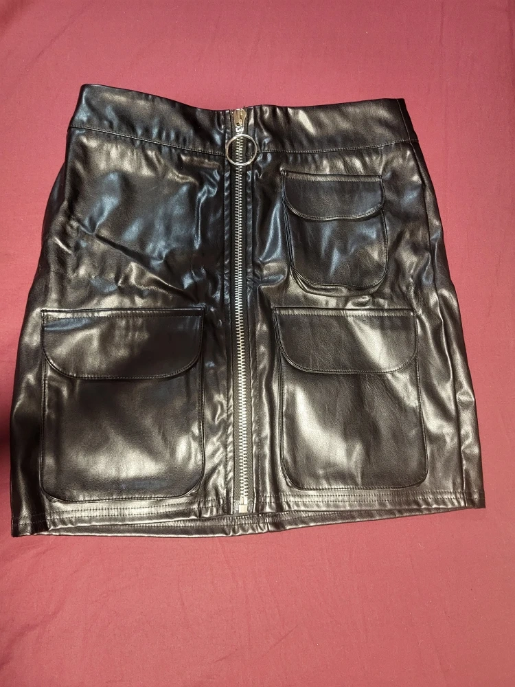 Selling a brand new stylish black faux leather mini skirt. It features a zipper down the front and handy pockets, adding a bit of edge to your wardrobe! Perfect for a night out or dressing up your everyday look