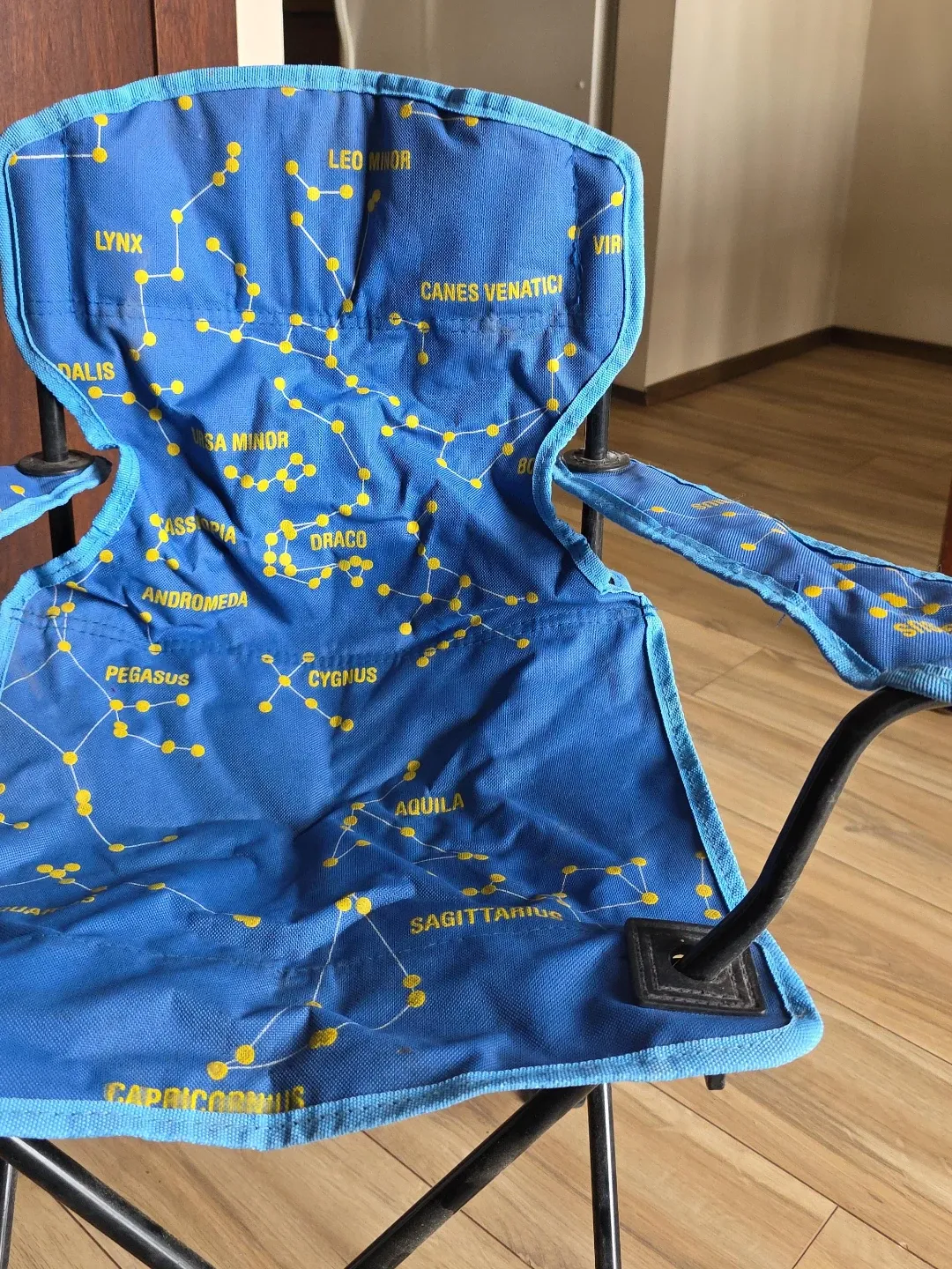 Selling a folding camp chair with a cool constellation design on a blue background. It's lightweight and portable, perfect for camping or outdoor events