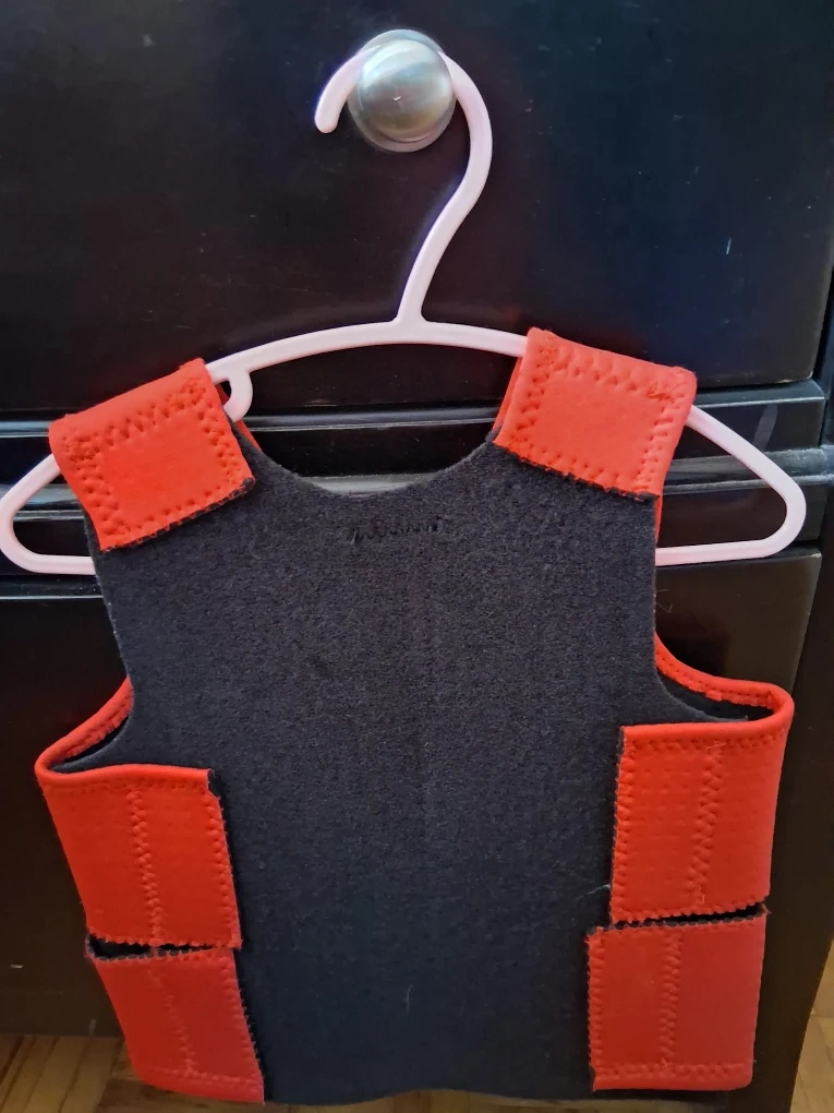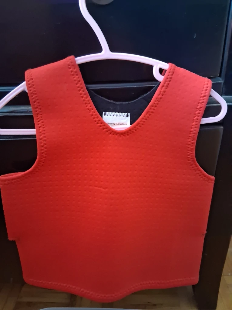 549Selling a gently used kids' extra small compression vest in red and black! It's in great shape and perfect for deep pressure sensory seakers. It's size is XS. There is one wolf pop it, fidget spinner pop it, rainbow crinkle sound fabric, green stretchy rope and a sensory bin filled with colored sand, buttons, toy dogs, pom poms and more.