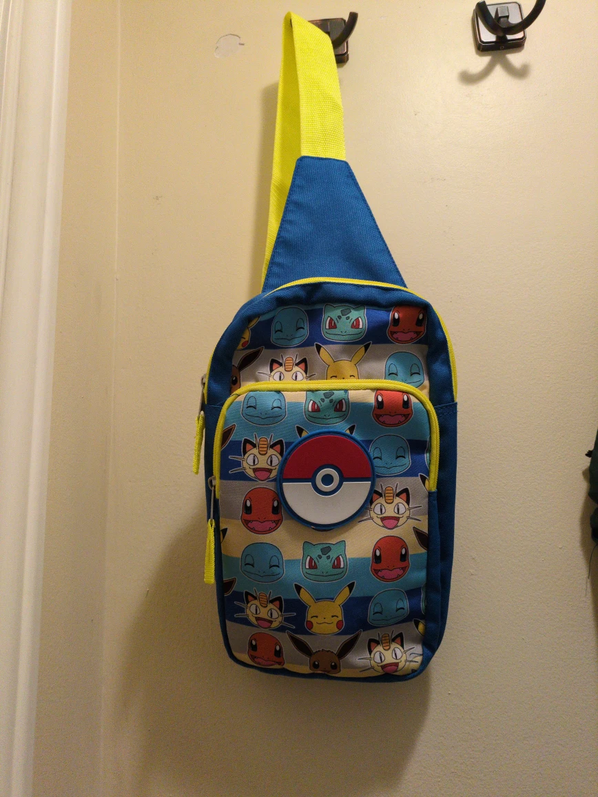 Here's a cute Pokemon sling bag! It features various Pokemon characters and a Pokeball design. Perfect for any Pokemon fan!