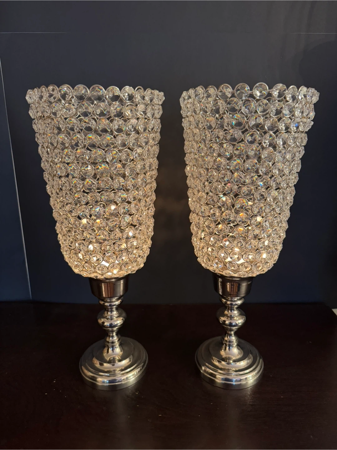 60Selling a set of two beautiful crystal beaded candle holders. They add a touch of elegance to any room and create a lovely ambiance when lit. Perfect for decorating your living space or for special occasions! High 16 inch,Diameter 6.5 inch