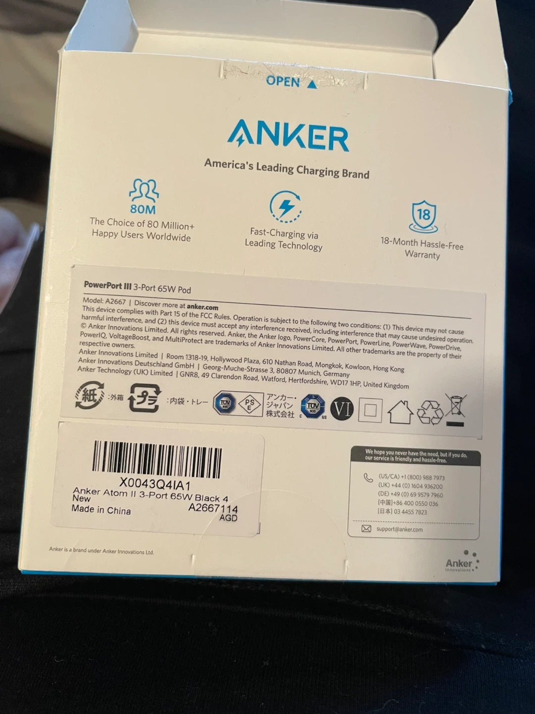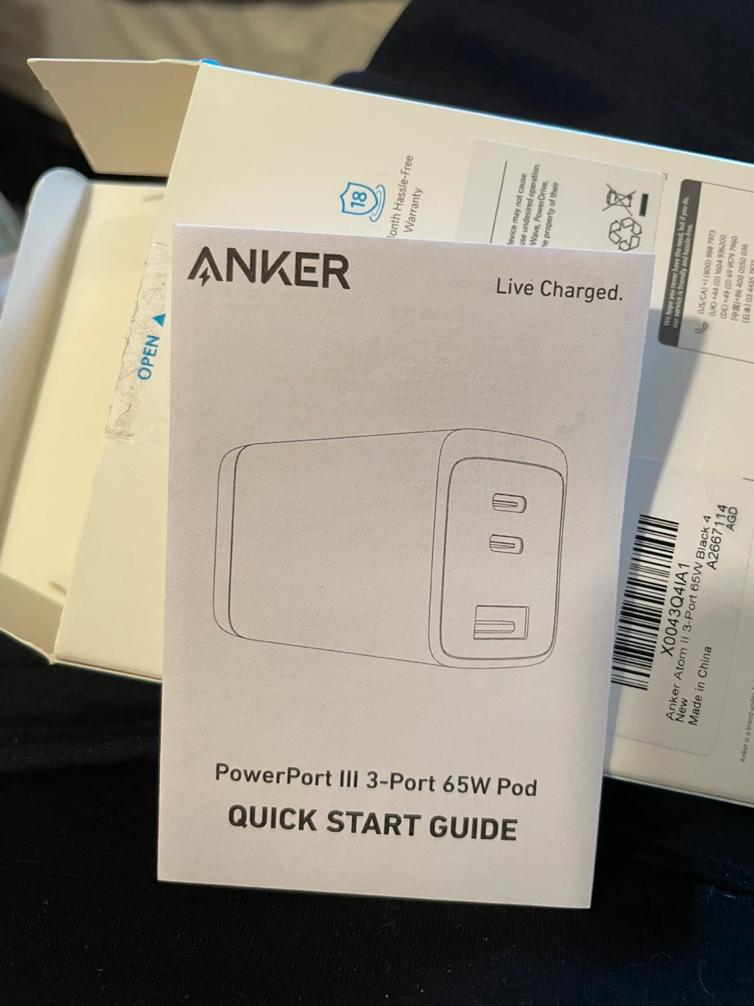 Selling a brand new Anker Atom III 3-Port 65W charger! It's the PowerPort III 3-Port 65W Pod model A2667. This charger is black and comes in its original box. It's a fast-charging option from America's Leading Charging Brand!