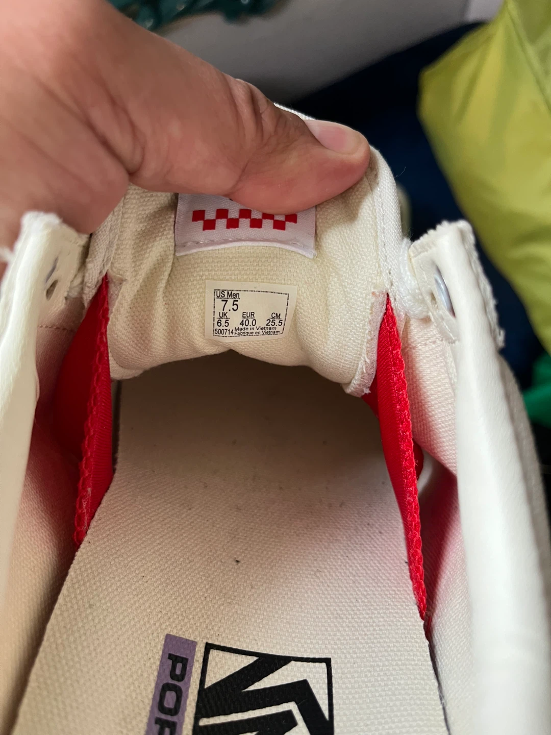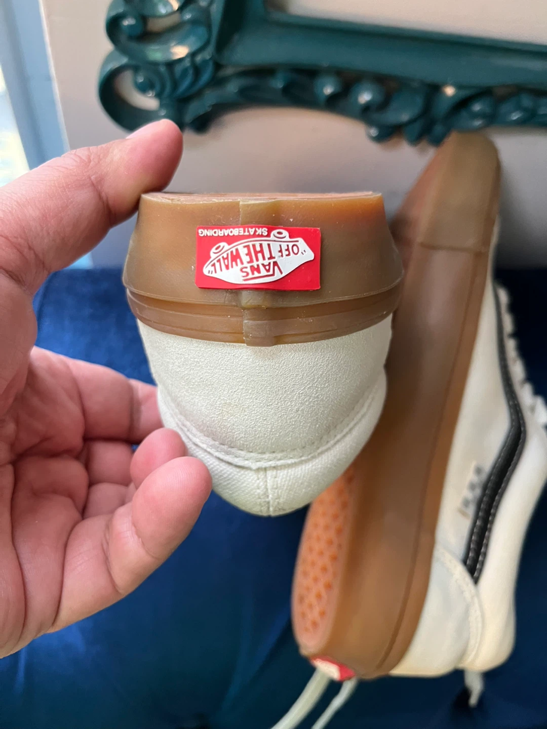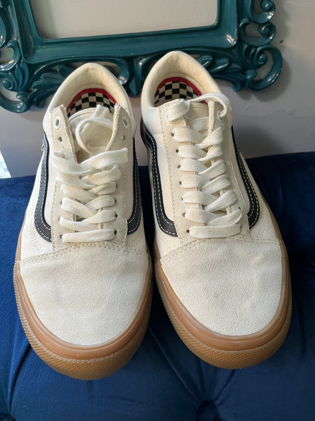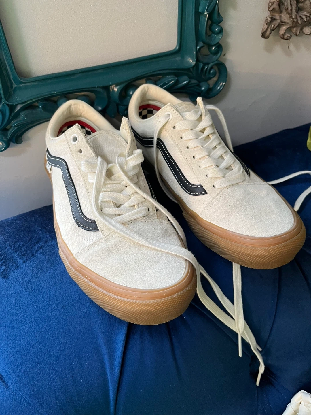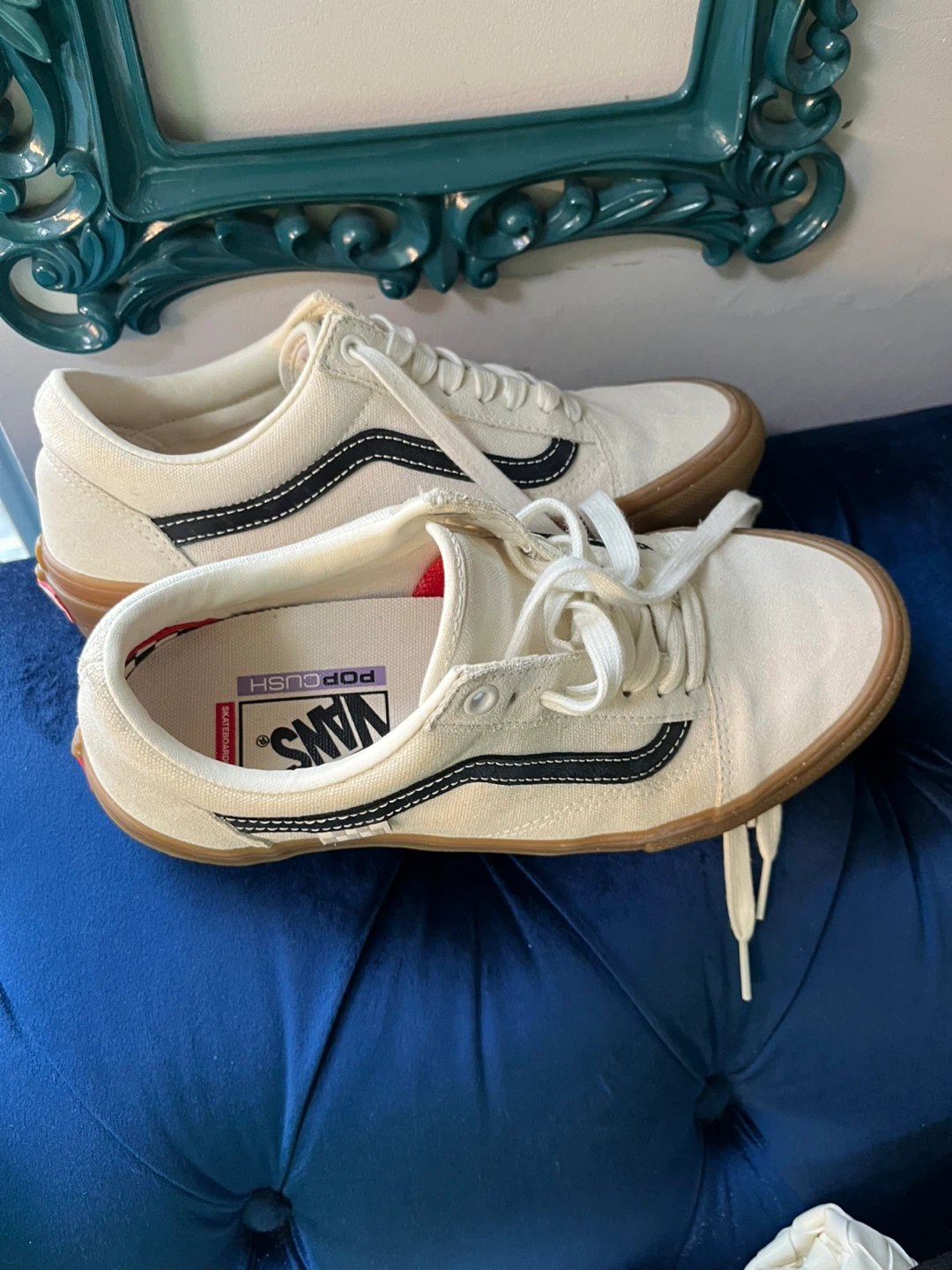 Classic Vans Old Skool skateboarding shoes! These have the iconic side stripe and a durable construction. The sole is a nice gum colour, and the uppers are a cream/off-white colour. Great for skating or everyday wear!