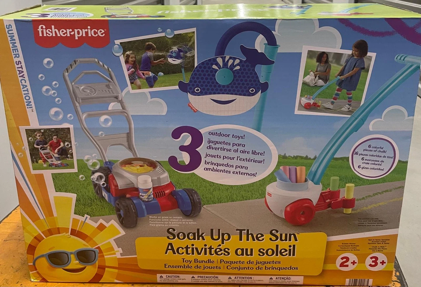 This is a brand new Fisher-Price Soak Up The Sun Activities toy bundle. Includes 3 outdoor toys and 6 colorful pieces of chalk. Recommended for ages 2+ and 3+