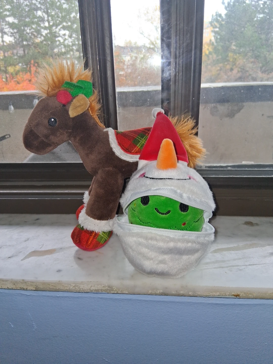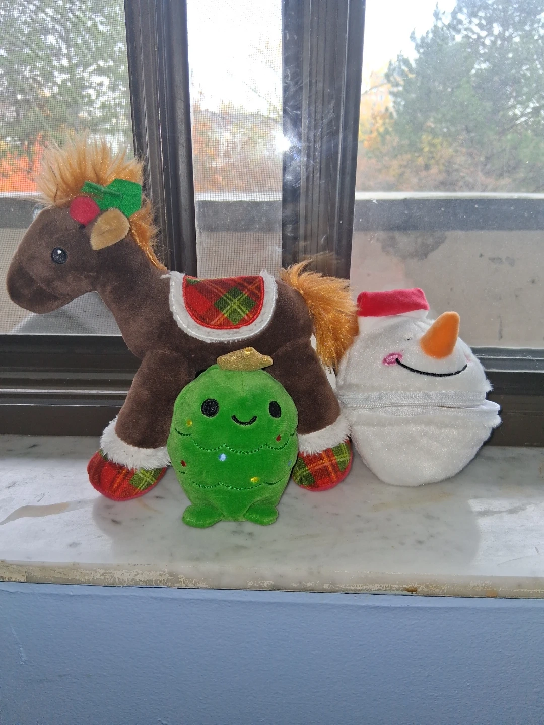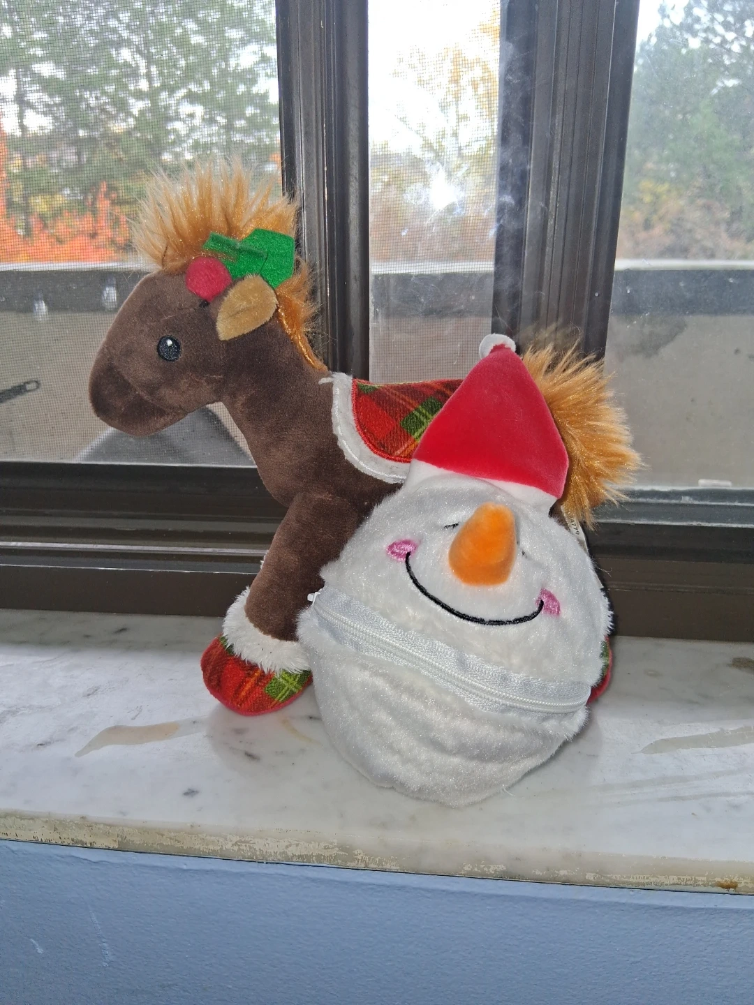 549Selling a set of cute Christmas-themed plush toys! Includes a horse with festive details, a smiling snowman, and a little green Christmas tree. Perfect for adding some holiday cheer to your home