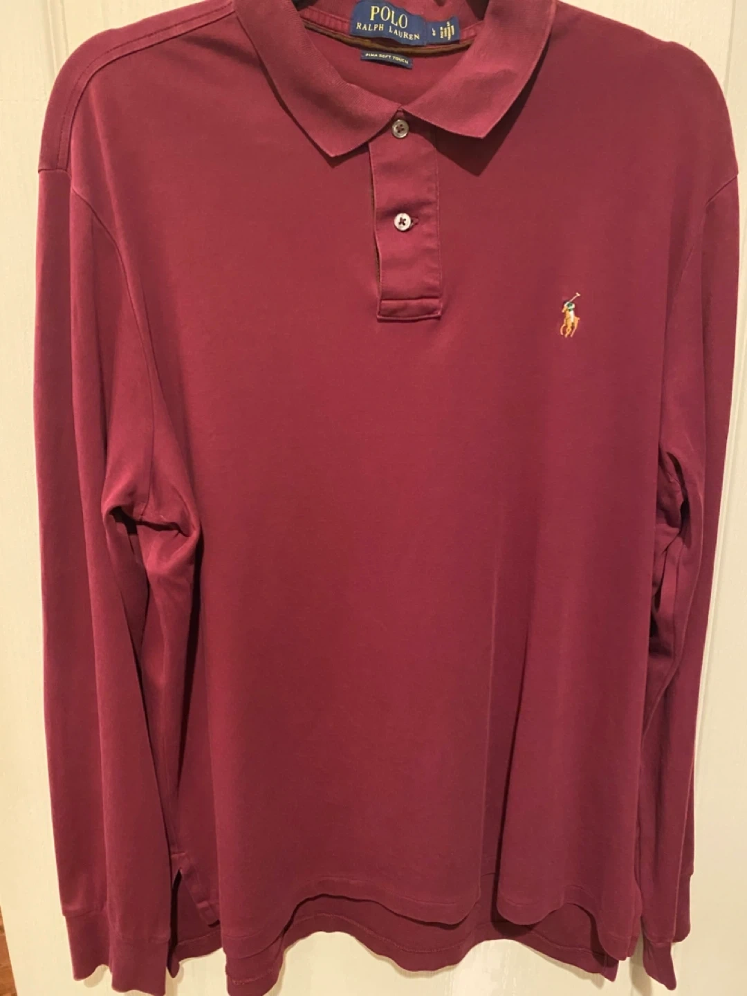 Here's a Polo Ralph Lauren long-sleeve polo shirt in size large! It's a lovely burgundy colour and made with Pima Soft Touch cotton