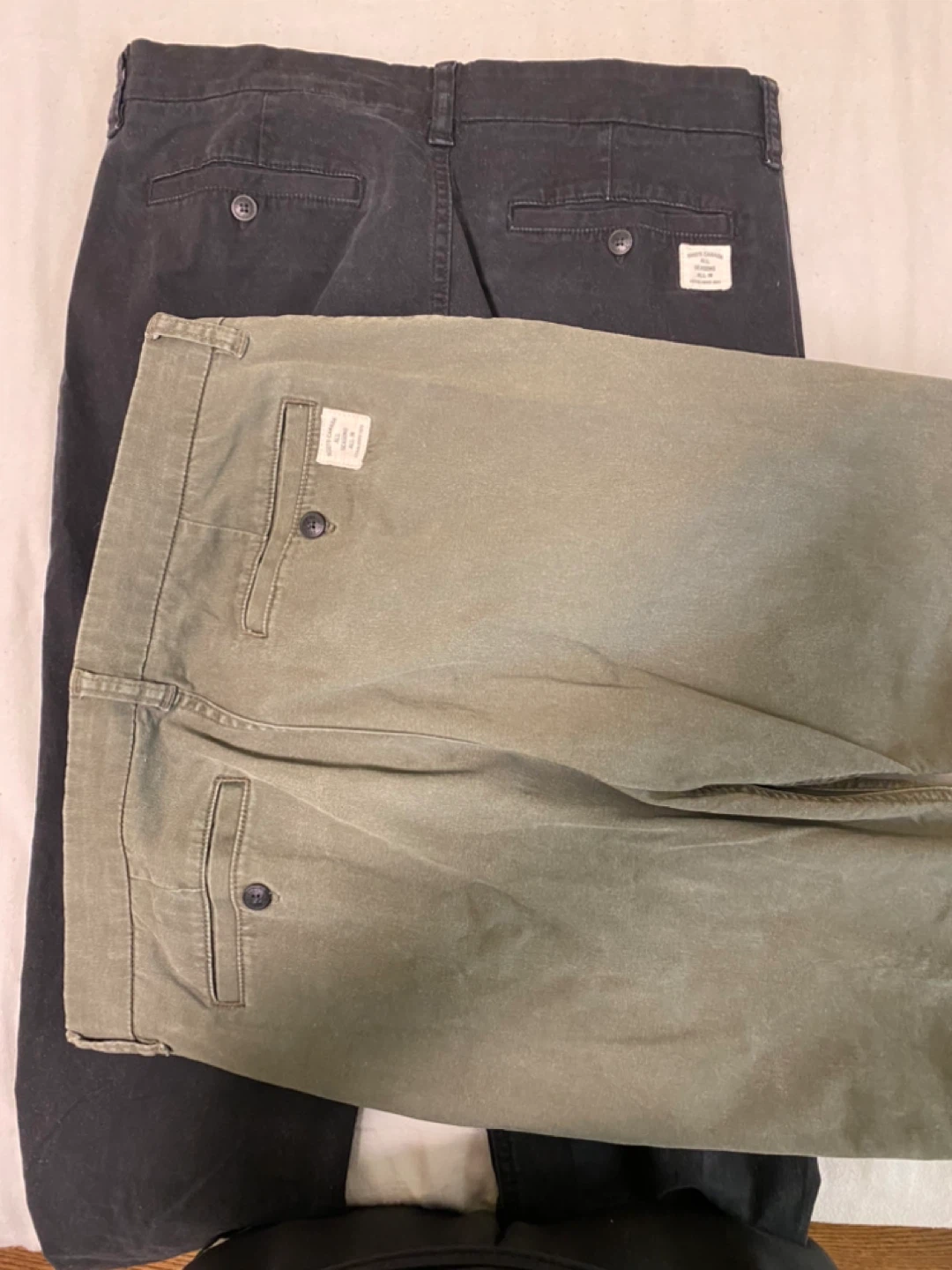 Selling a couple of pairs of Roots pants. One is black and the other is an olive green colour. Both are size 32. 97%cotton 3%spandex. No hem