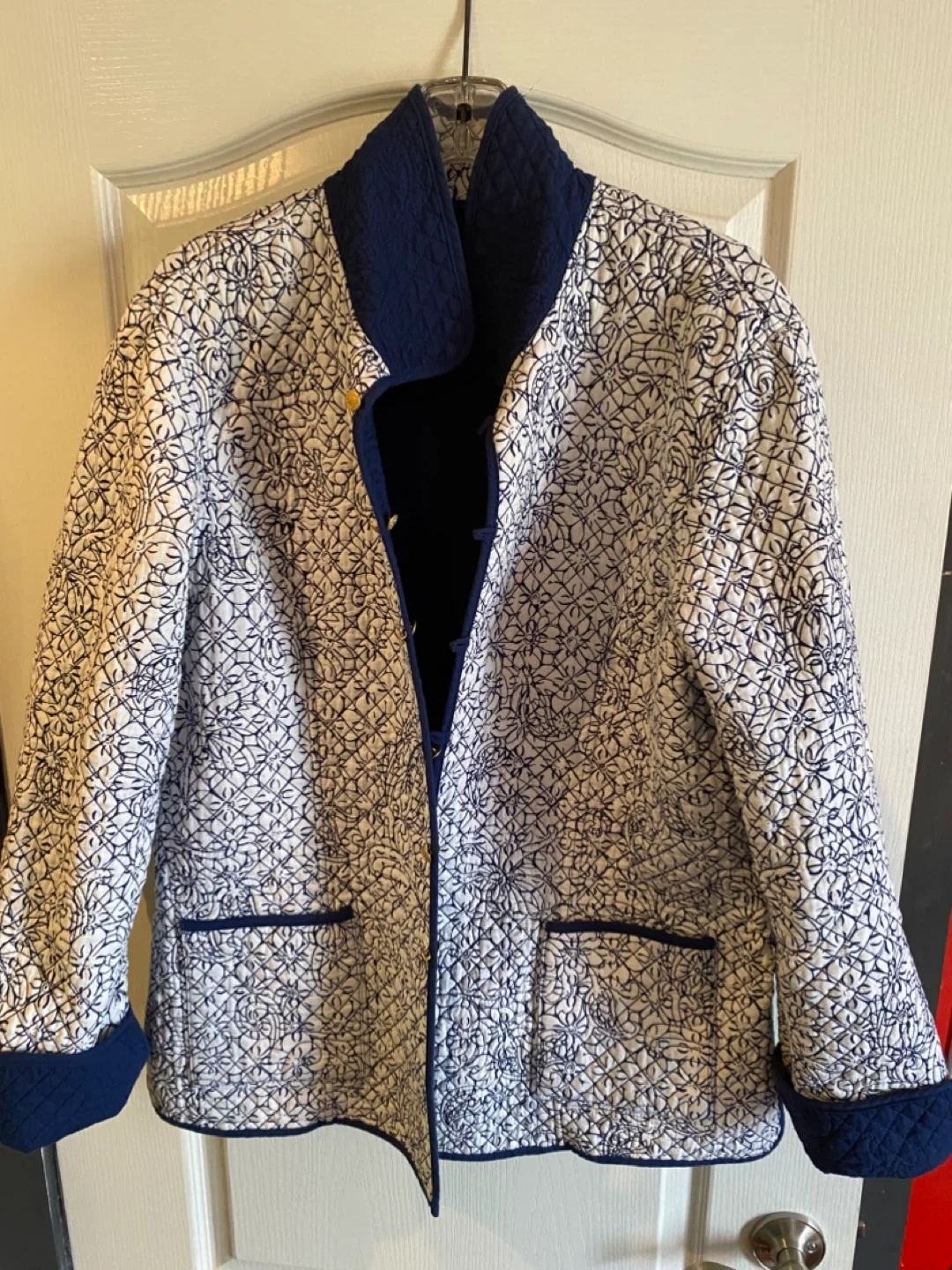 This is a lovely quilted jacket that's reversible, giving you two looks in one! One side features a charming white and blue pattern, while the other is a solid navy blue. It's in great condition and perfect for adding a bit of warmth and style to your outfit