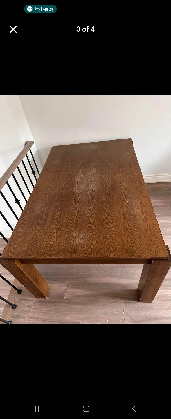 Solid wood dinner table modern 61.4 inch wide 35.4 inch depth There are some area on the top where it's wore out from normal wear and tear. Simply polish will fix it easily. Table retail for $999