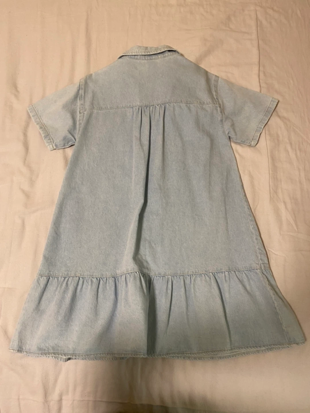 37Here's a cute Zara denim dress in size 13-14! It's in great condition and ready for a new home. Perfect for casual outings or dressing up with some accessories. It has short sleeves and a button-up front with pockets