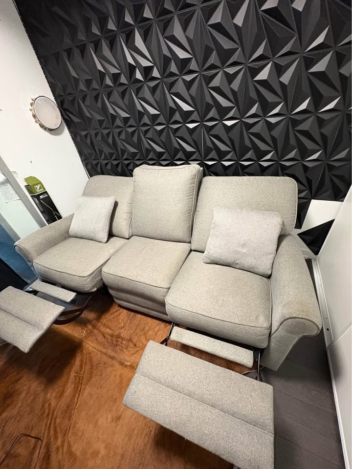 Comfortable and clean light grey 3-seater reclining sofa, ideal for any living room, den, or office. Both end seats recline smoothly with motorized levers.